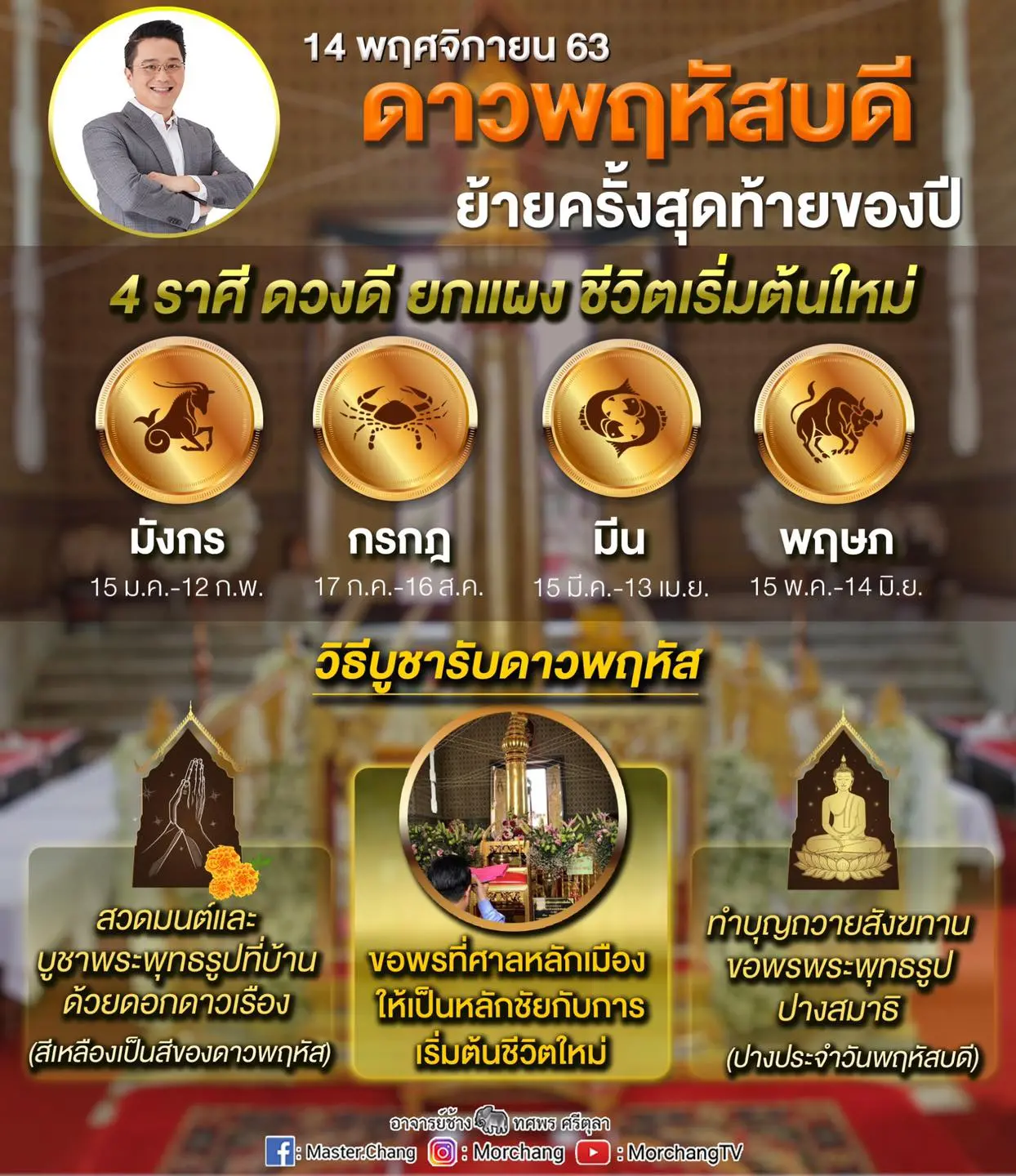 12 พ.ย. 63 หมอช้าง ทศพร ได้โพสต์เฟซบุ๊กเผยว่า 14 พฤศจิกายน ดาวพฤหัสย้ายราศีครั้งสุดท้ายของปี การย้ายครั้งนี้จะส่งผลให้ผู้ที่เกิด ราศีมังกร, กรกฎ, มีน และพฤษภ ดวงชะตาจะเปลี่ยนไปในทางที่ดีขึ้น