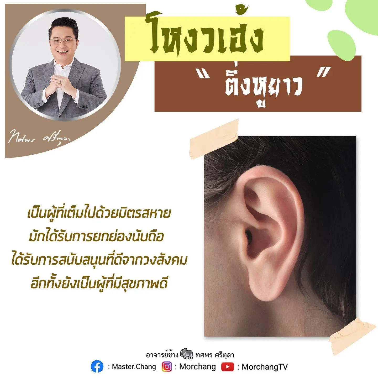 หมอช้าง ทศพร ศรีตุลา เผย ลักษณะ โหงวเฮ้ง ของคนที่สุขภาพดี อายุขัยยืนยาว เป็นที่ยกย่องของคนในสังคม ผ่านทางแฟนเพจ หมอช้าง ทศพร ศรีตุลา