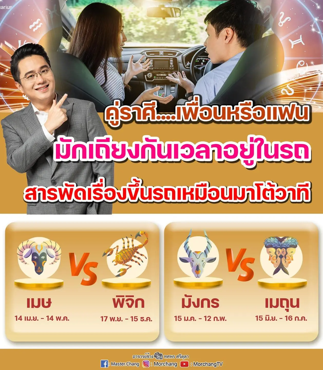 หมอช้าง ทศพร ศรีตุลา เผย ราศี ดวงคู่กัด เป็นคู่ราศีที่ต้องเถียงกันตลอด ประหนึ่งโต้วาที โดยได้โพสต์ผ่านทางแฟนเพจ หมอช้าง ทศพร ศรีตุลา