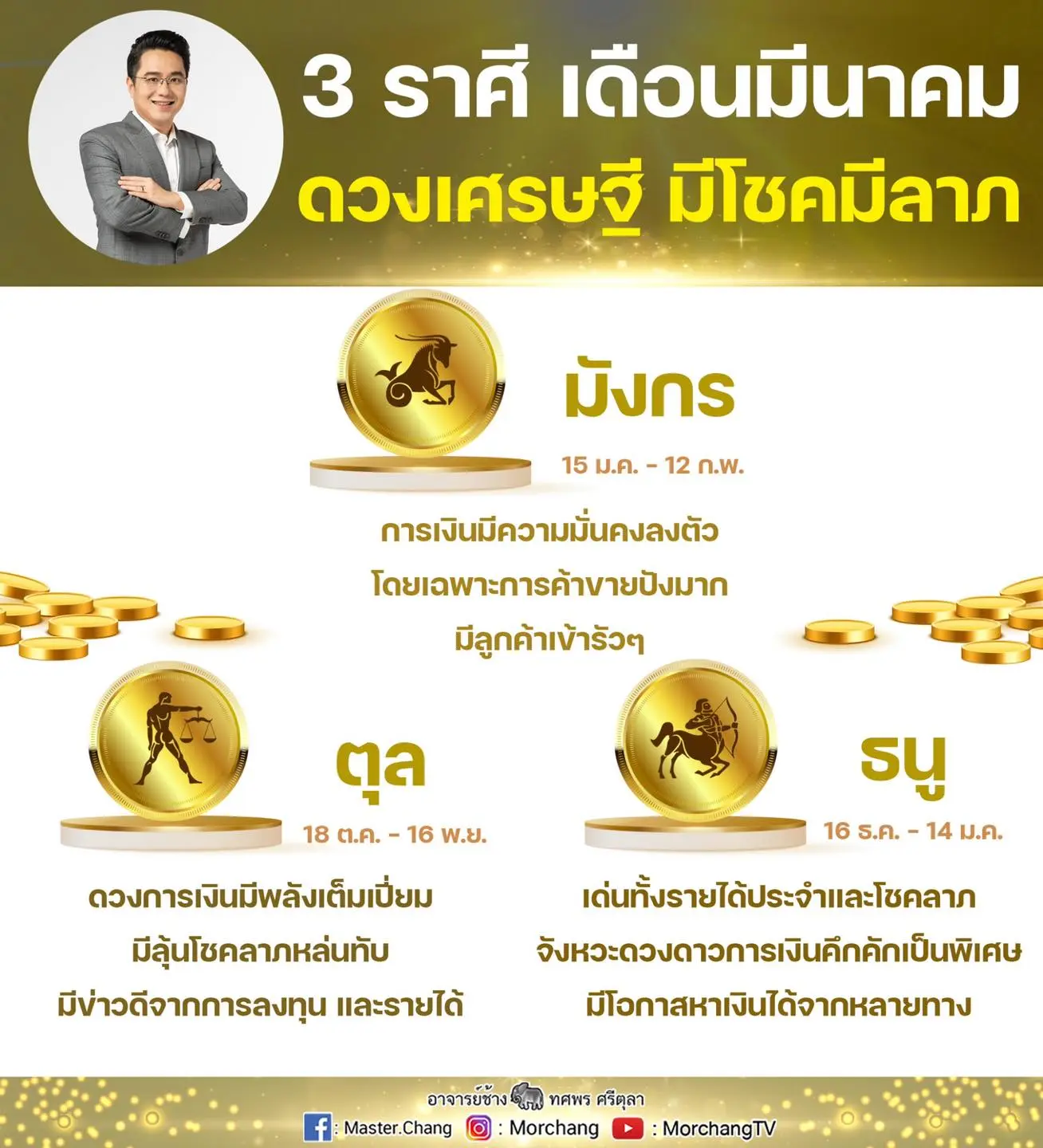 โดย หมอช้าง ทศพร ศรีตุลา ได้กล่าวถึง ดวง 3 ราศี มีโชคมีลาภ