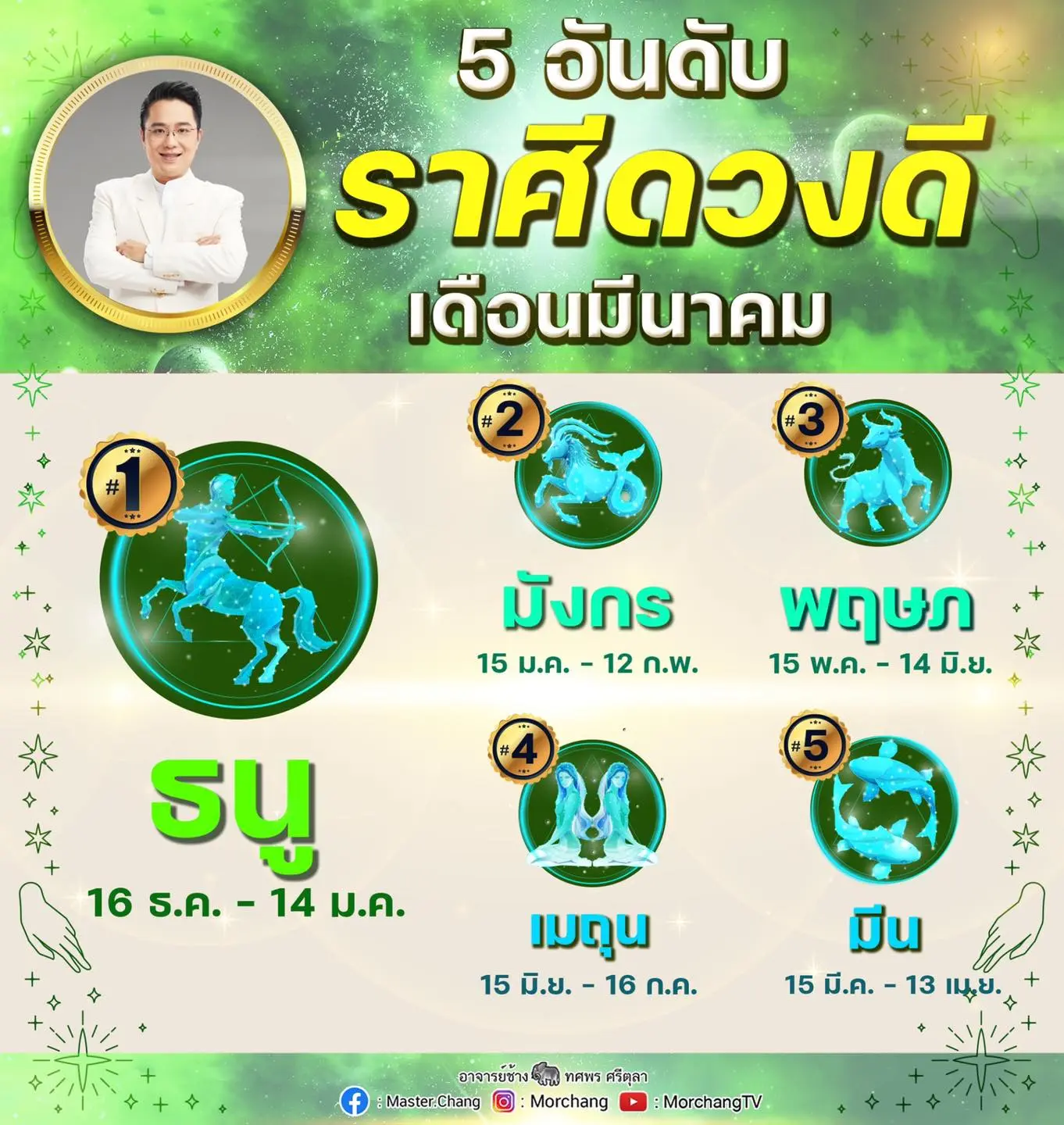 หมอช้าง ทศพร ศรีตุลา เผย 5 อันดับ ราศีดวงดี ดวงเฮงที่สุดในเดือน “มีนาคม” 2565 ผ่านทางแฟนเพจ หมอช้าง ทศพร ศรีตุลา