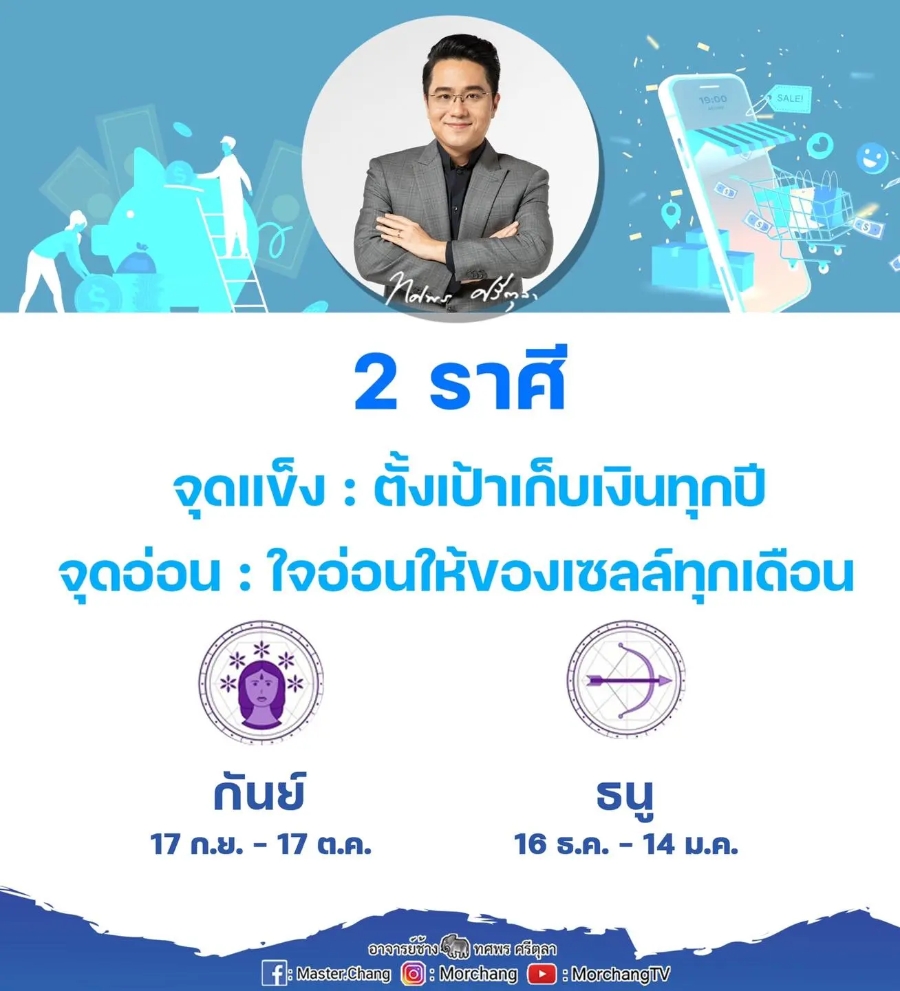 หมอช้าง ทศพร ศรีตุลา เผย ดวง 2 ราศี จุดแข็งจุดอ่อน เปิดความลับด้านการเงินของราศีเหล่านี้ โดยได้โพสต์ผ่านทางแฟนเพจ หมอช้าง ทศพร ศรีตุลา