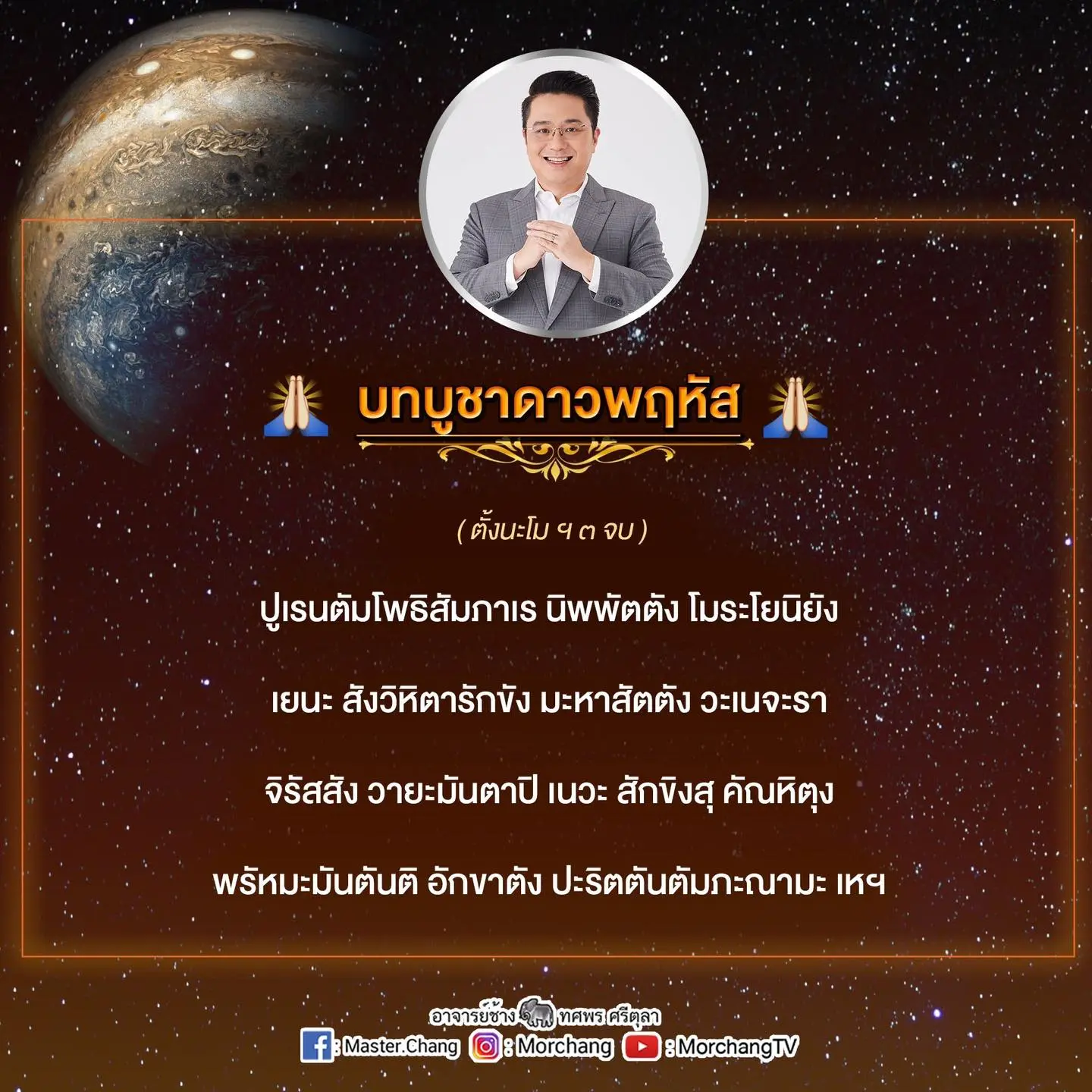 หมอช้าง หรือ นาย ทศพร ศรีตุลา หมอดูนักพยากรณ์ชื่อดังของประเทศไทย ได้โพสต์ภาพพร้อมข้อความผ่านทางเพจเฟสบุ้ค หมอช้าง ทศพร ศรีตุลา ว่า ดาวพฤหัสจะโคจรพักร์องศาย้ายราศีในวันที่17กรกฎาคม