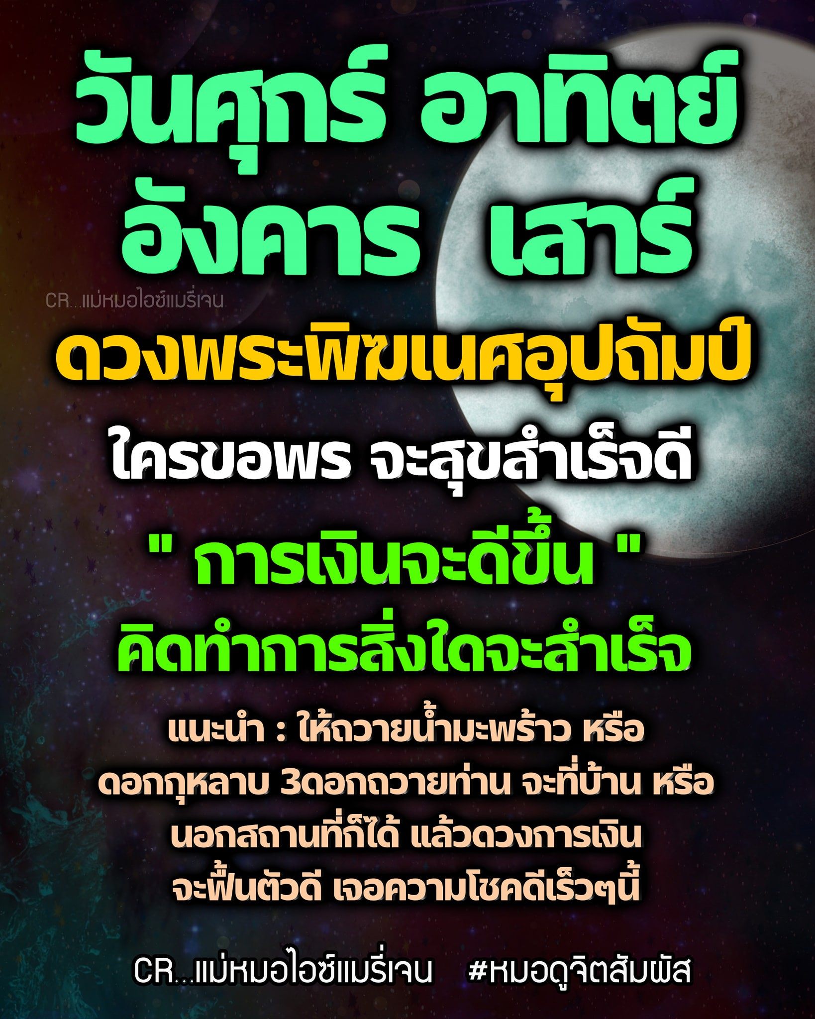 แม่หมอไอซ์ แมรี่เจน หมอดูจิตสัมผัสหมอดูชื่อดังกระแสมาแรงได้โพสต์คำทำนายผ่านเพจเฟสบุ๊ค แม่หมอไอซ์แมรี่เจน ว่า ช่วงนี้ดวงถูกชะตากับพระพิฆเนศ ท่านจะคอยหนุนดวงปกปักษ์ดูแล