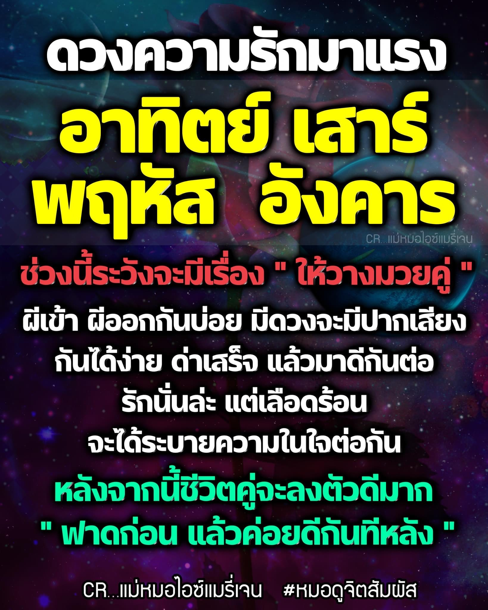 แม่หมอไอซ์ แมรี่เจน หมอดูจิตสัมผัสหมอดูชื่อดังกระแสมาแรงได้โพสต์คำทำนายผ่านเพจเฟสบุ๊ค แม่หมอไอซ์แมรี่เจน ว่า #ดวงความรักร้อนแรง ปากจัดจ้าน อารมณ์พร้อมปะทะ ระวังจะกัดกันบ่อย ( ด้วยเรื่องไร้สาระ )