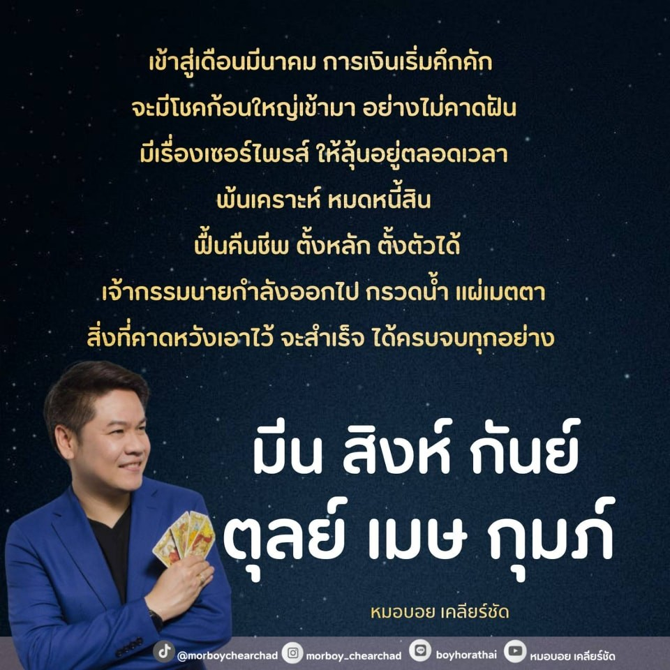 หมอบอย เคลียร์ชัด หมอดูนักพยากรณ์ ที่ปรึกษาดวงชะตาชื่อดังโพสต์ผ่านเฟสบุ๊คเพจ หมอบอย เคลียร์ชัด ว่า มีนา พารวย