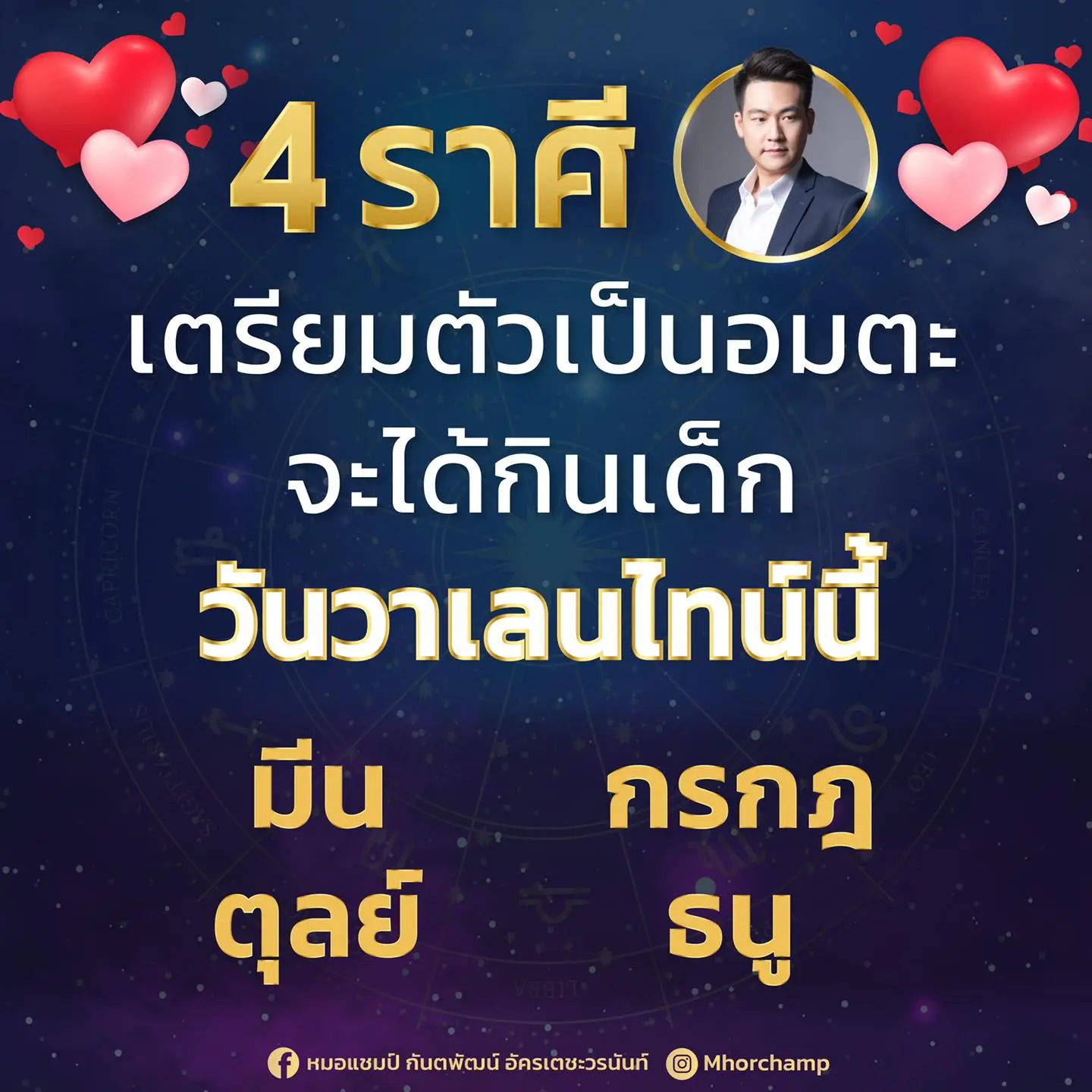 หมอแชมป์ กันตพัฒน์ เผย ดวง 4 ราศี เป็นอมตะ วาเลนไทน์นี้จะได้กินเด็ก เคี้ยวหญ้าอ่อน! โดยได้โพสต์ผ่านแฟนแพจ หมอแชมป์ กันตพัฒน์ อัครเตชะวรนันท์
