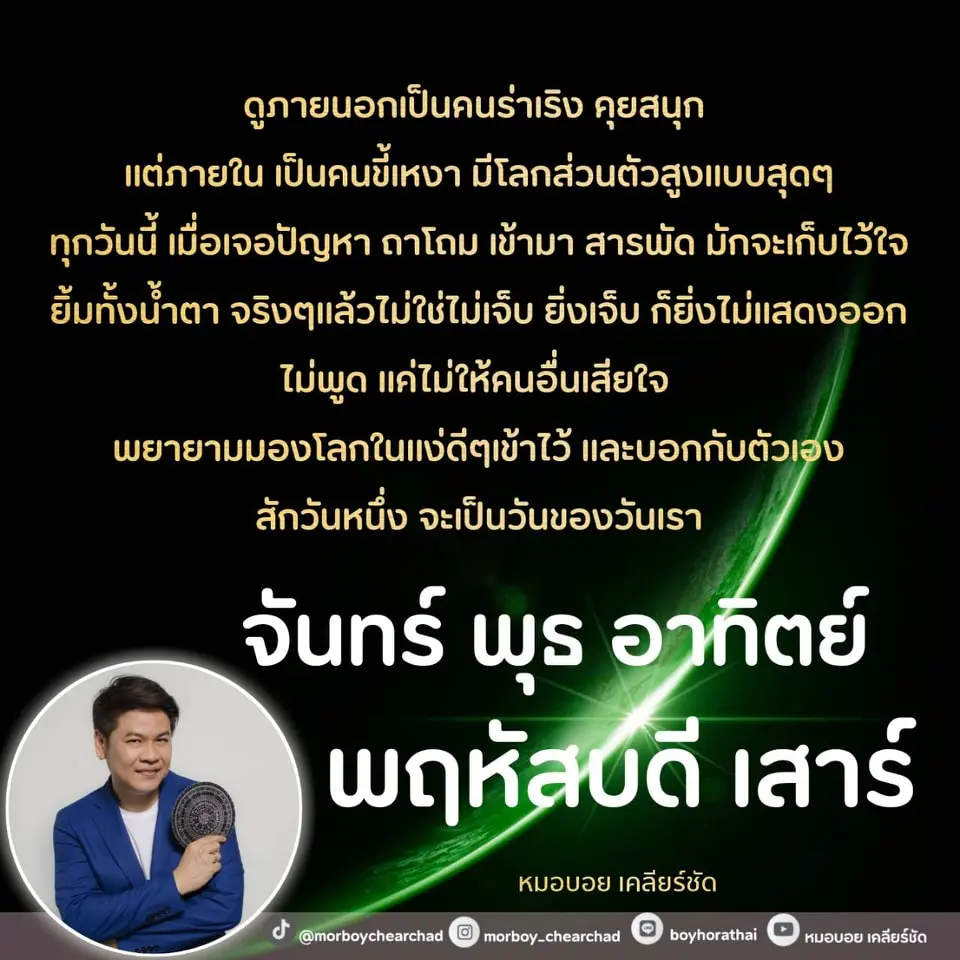 หมอบอย เคลียร์ชัด เผย ดวง 5 วันเกิด ฟ้าหลังฝน สารพัดปัญหาที่ถาโถมเข้ามา จะหมดไปในไม่ช้า โดยได้โพสต์ผ่านแฟนเพจ หมอบอย เคลียร์ชัด