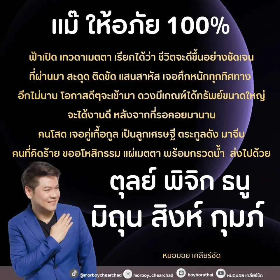 หมอบอย เคลียร์ชัด เผย ดวง 6 ราศี ฟ้าให้อภัย 100% ถึงเวลาฟ้าเปิด ชีวิตจากหม่นหมอง จะกลับมาสดใส โดยได้โพสต์ผ่านแฟนเพจ หมอบอย เคลียร์ชัด