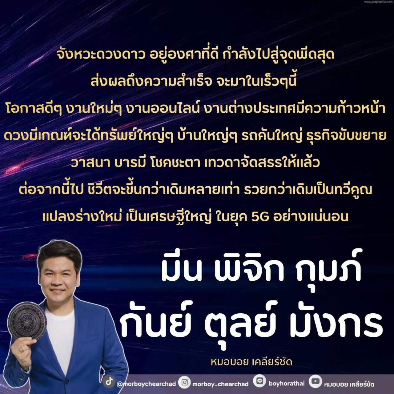 หมอบอย เคลียร์ชัด เผย ดวง 6 ราศี เศรษฐียุค 5G อะไรใหม่ๆเข้ามาไม่ยั้ง โอกาสใหม่ งานใหม่ บ้านใหม่ โดยได้โพสต์ผ่านแฟนเพจ หมอบอย เคลียร์ชัด