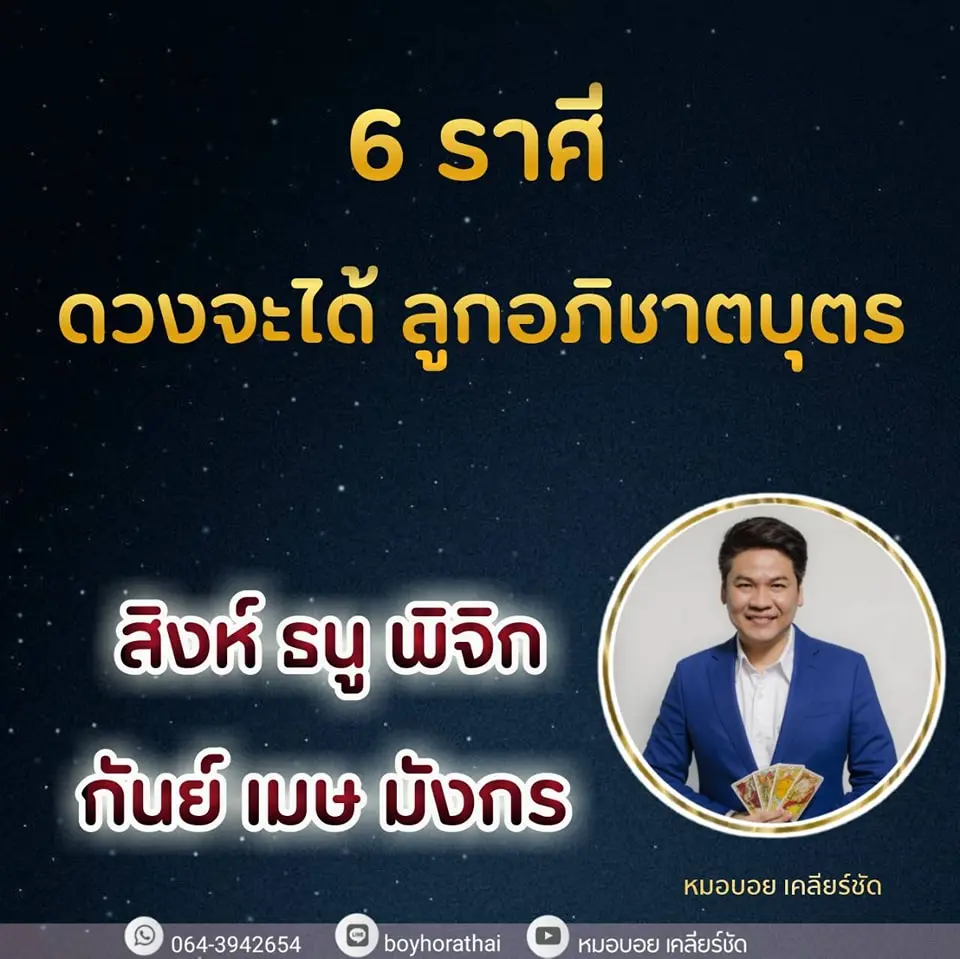 หมอบอย เคลียร์ชัด นักพยากรณ์ดวงชะตาชื่อดัง เผย ดวงชะตา 6 ราศี จะได้ลูกดี เป็นเด็กมีบุญ อภิชาตบุตร โดยได้โพสต์ผ่านแฟนเพจ หมอบอย เคลียร์ชัด