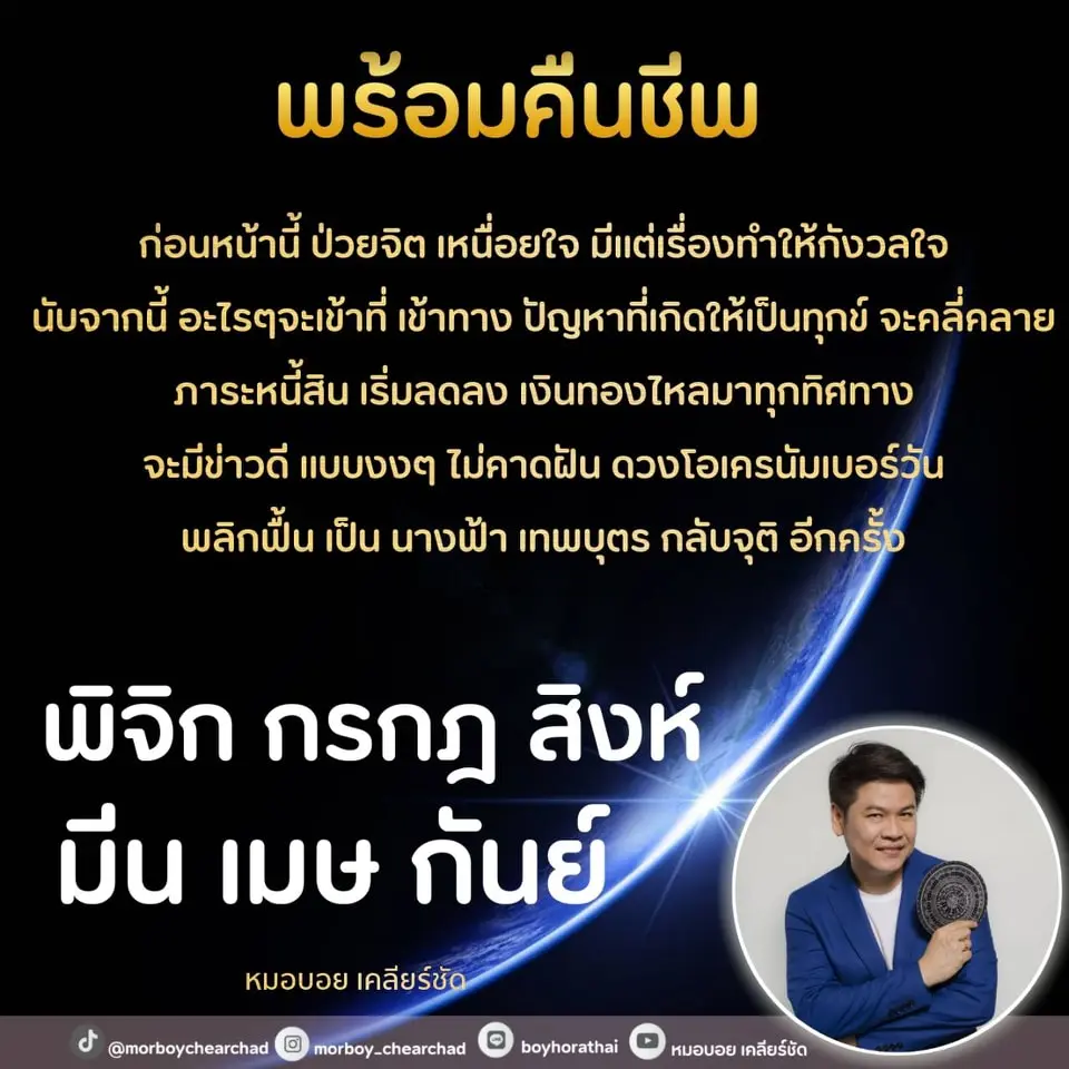 หมอบอย เคลียร์ชัด เผย ดวง 6 ราศี ชีวิตพลิกฟื้น ปัญหาคลี่คลาย หนี้สินลดลง รายได้เพิ่มมากขึ้น! โดยได้โพสต์ผ่านแฟนแพจ หมอบอย เคลียร์ชัด