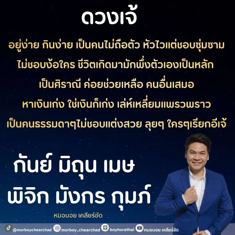 หมอบอย เคลียร์ชัด เผย ดวง 6 ราศี สวย รวย มั่น หาเงินเก่ง เกิดมาเพื่อเป็นเสาหนักของครอบครัว โดยได้โพสต์ผ่านแฟนแพจ หมอบอย เคลียร์ชัด