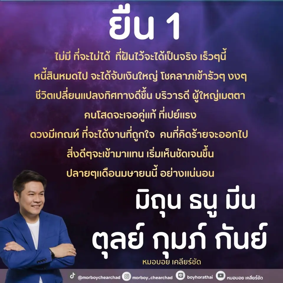 หมอบอย เคลียร์ชัด เผย ดวง 6 ราศี ฝันเป็นจริง สิ่งที่คิด และ สิ่งที่หวังไว้ จะเป็นจริงในเร็วๆนี้ โดยได้โพสต์ผ่านแฟนเพจ หมอบอย เคลียร์ชัด