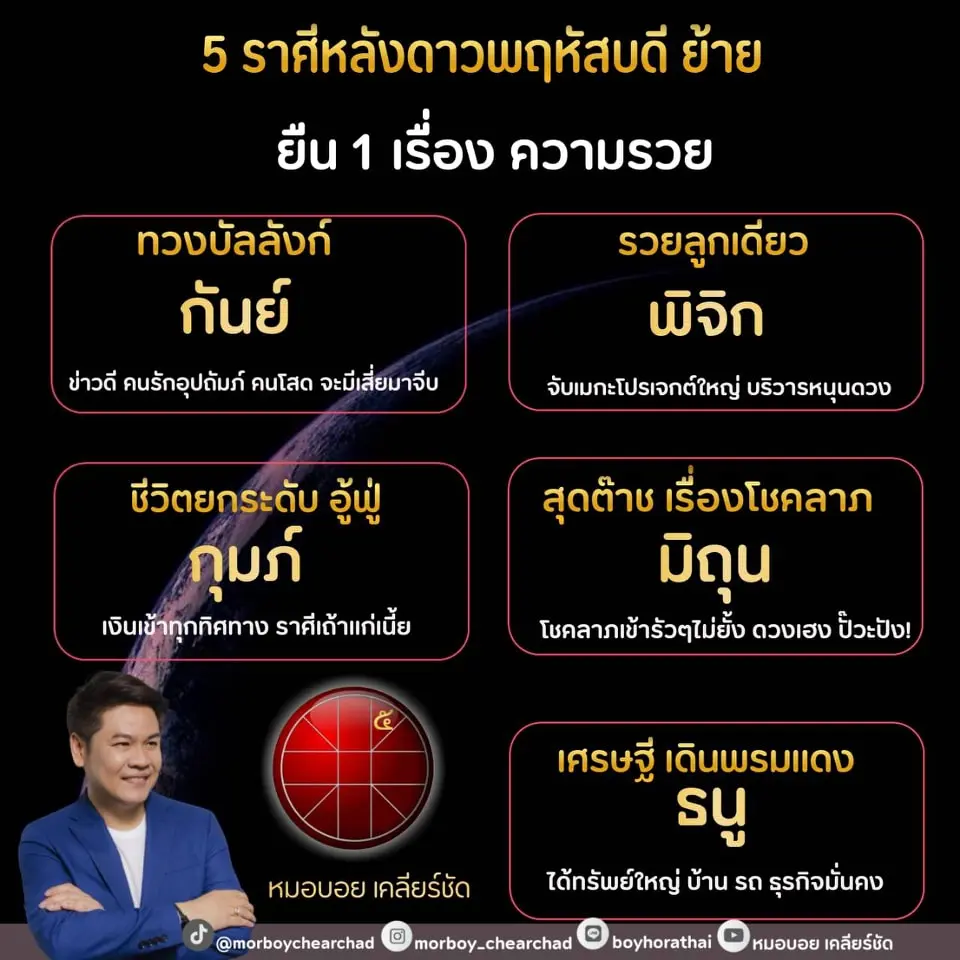 หมอบอย เคลียร์ชัด เผย ดวง 5 ราศี หลังดาวพฤหัสย้าย ยืนหนึ่งเรื่องความรวย การเงินดีมากแบบไม่คาดฝัน โดยได้โพสต์ผ่านแฟนเพจ หมอบอย เคลียร์ชัด