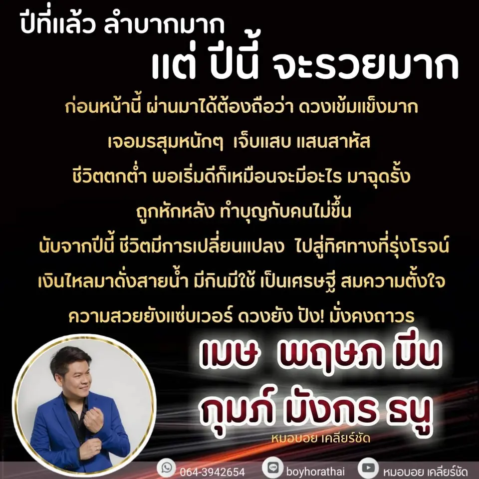 หมอบอย เคลียร์ชัด นักพยากรณ์ดวงชะตาชื่อดัง เผย ดวงชะตา 6 ราศี ปีที่แล้วลำบาก แต่ปีนี้จะรวยมาก โดยได้โพสต์ผ่านแฟนเพจ หมอบอย เคลียร์ชัด