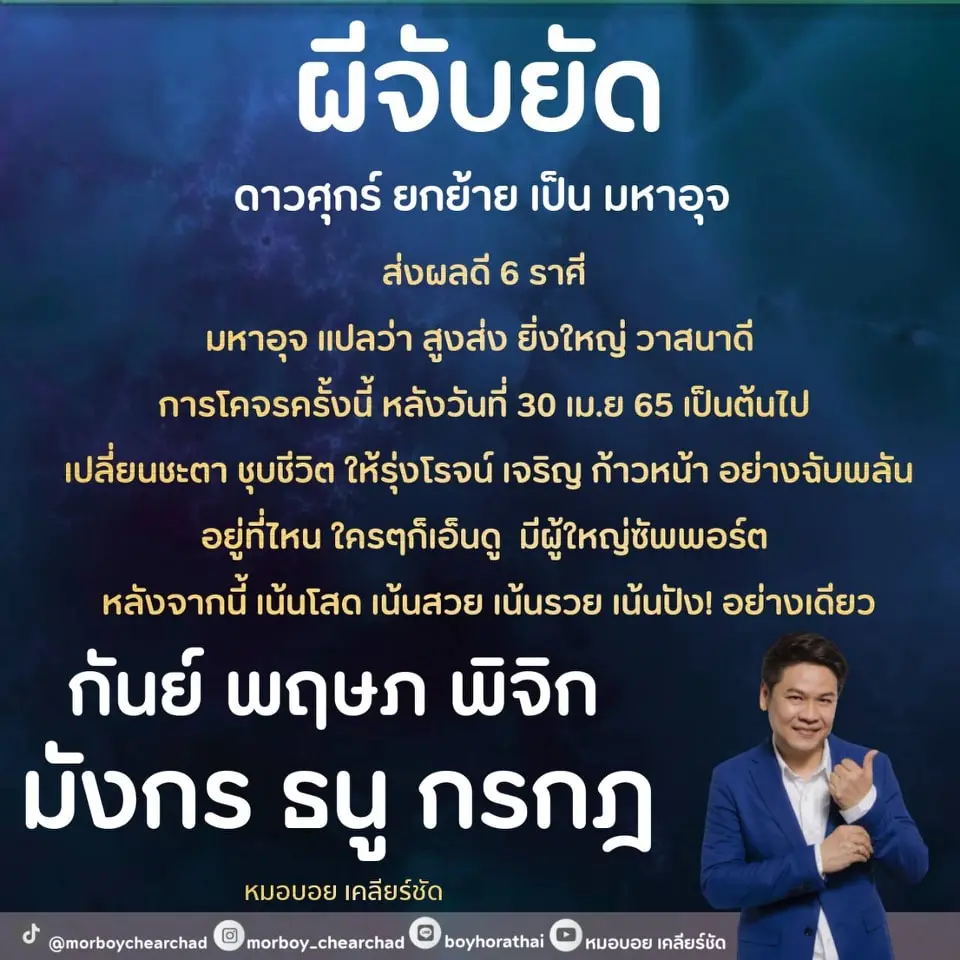 หมอบอย เคลียร์ชัด เผย ดวง 6 ราศี มหาอุจ ดาวศุกร์ย้าย ส่งผลไปในทางที่ดี มีการเปลี่ยนแปลง โดยได้โพสต์ผ่านแฟนเพจ หมอบอย เคลียร์ชัด