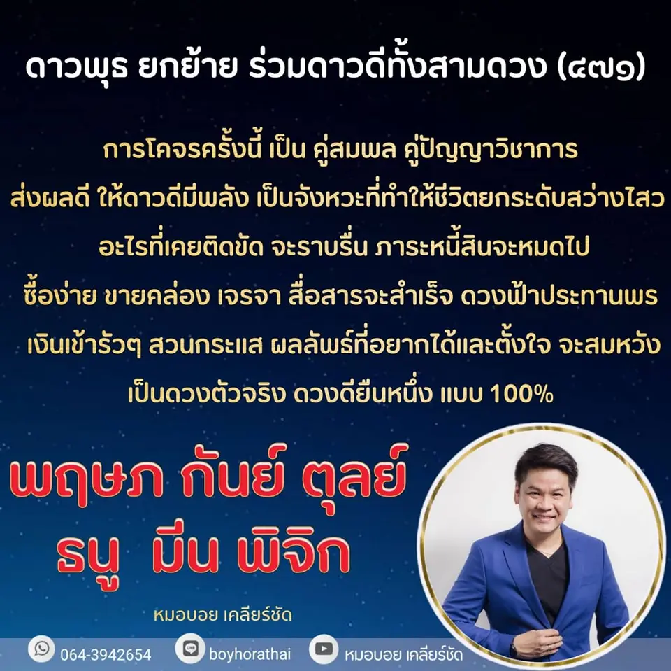 หมอบอย เคลียร์ชัด เผย ดวง 6 ราศี ดาวพุธย้าย ส่งผลดีกับชีวิต สิ่งที่ติดๆขัดๆรวมถึงหนี้สินจะหมดไป โดยได้โพสต์ผ่านแฟนแพจ หมอบอย เคลียร์ชัด