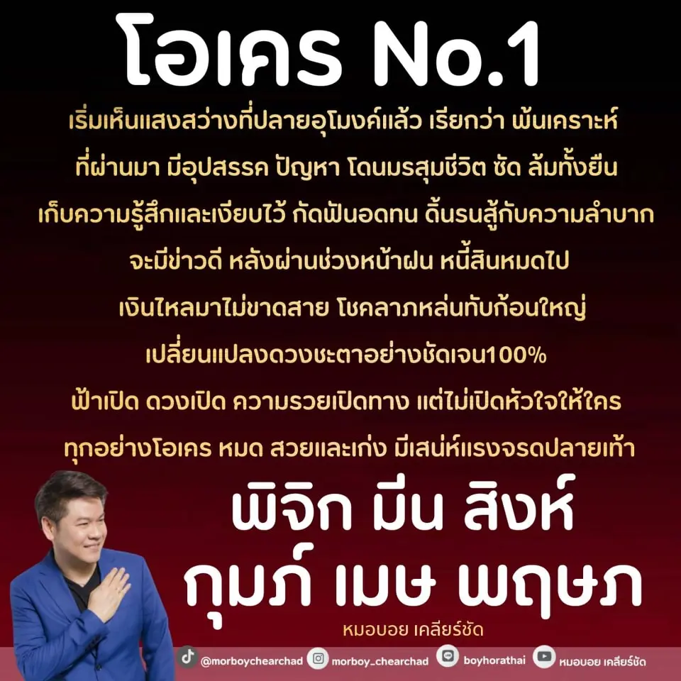 หมอบอย เคลียร์ชัด เผย ดวง 6 ราศี พ้นเคราะห์ ความรวยเปิดทาง การงานก้าวไกล แต่หัวใจยังไม่เปิดรับ โดยได้โพสต์ผ่านแฟนเพจ หมอบอย เคลียร์ชัด