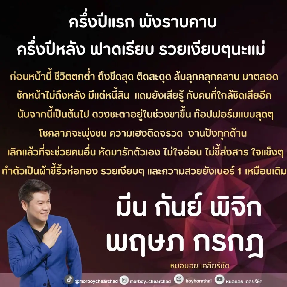 หมอบอย เคลียร์ชัด เผย ดวง 5 ราศี เฮงติดจรวด ครึ่งปีแรกอาจจะพัง แต่ครึ่งปีหลังความปังมาแน่ โดยได้โพสต์ผ่านแฟนเพจ หมอบอย เคลียร์ชัด