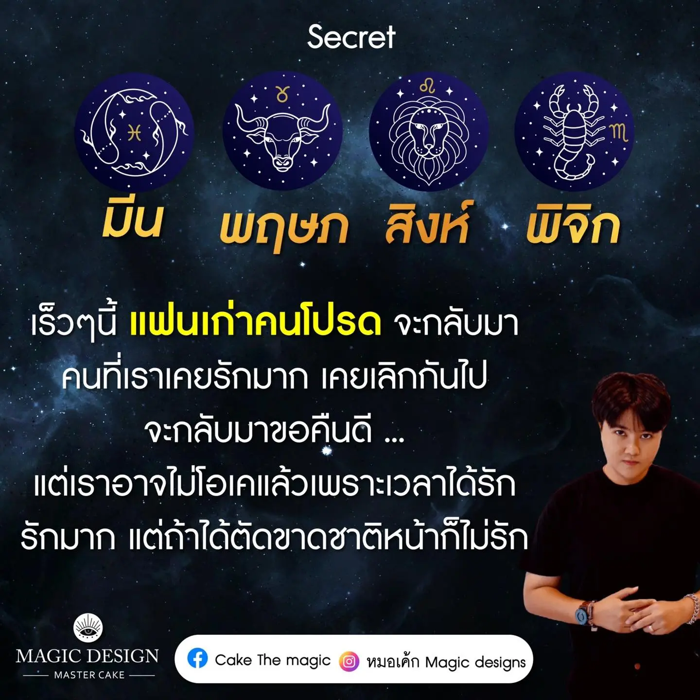 หมอเค้ก Magic stone เผย ดวง 4 ราศี แฟนเก่าจะกลับมา ถ่ายไฟเก่ามันร้อน แต่จะถูกดับด้วยถังดับเพลิง โดยได้โพสต์ผ่านแฟนเพจ หมอเค้ก Magic stone