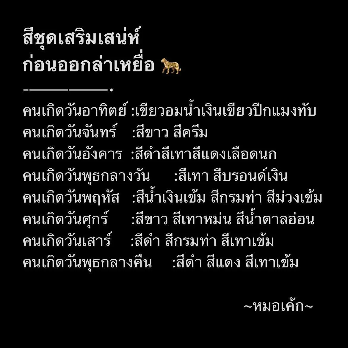 หมอเค้ก Magic stone เผย สีเสื้อมงคล สีชุดเสริมเสน่ห์ ที่ใส่ออกไปล่าเหยื่อแล้วได้กินแน่นอน โดยได้โพสต์ผ่านแฟนเพจ หมอเค้ก Magic stone