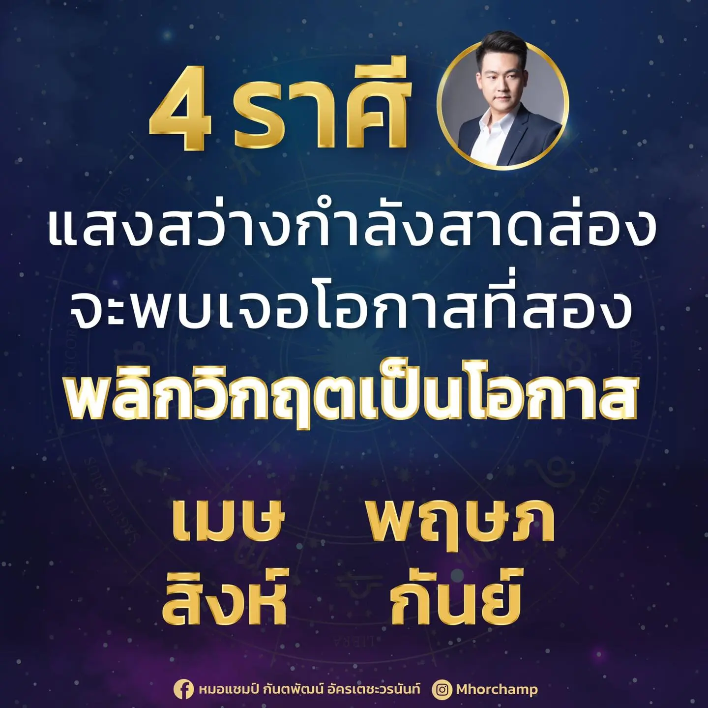 หมอแชมป์ กันตพัฒน์ เผย ดวง 4 ราศี ทุกขลาภ วิกฤตที่เข้าจะกลายเป็นโอกาส โดยได้โพสต์ผ่านแฟนแพจ หมอแชมป์ กันตพัฒน์ อัครเตชะวรนันท์