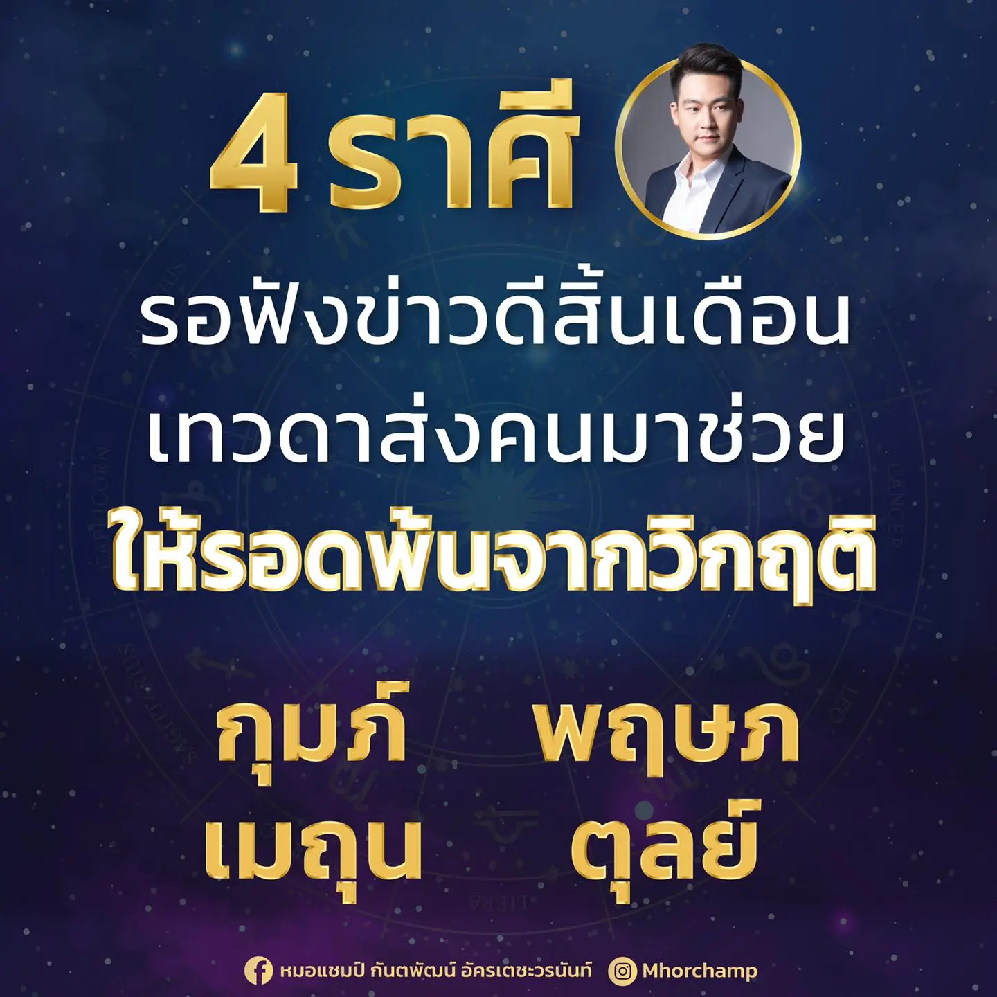หมอแชมป์ กันตพัฒน์ เผย ดวงการเงิน 4 ราศี มีข่าวดี จะมีคนเข้ามาช่วยเรื่องการเงิน โดยได้โพสต์ผ่านแฟนแพจ หมอแชมป์ กันตพัฒน์ อัครเตชะวรนันท์