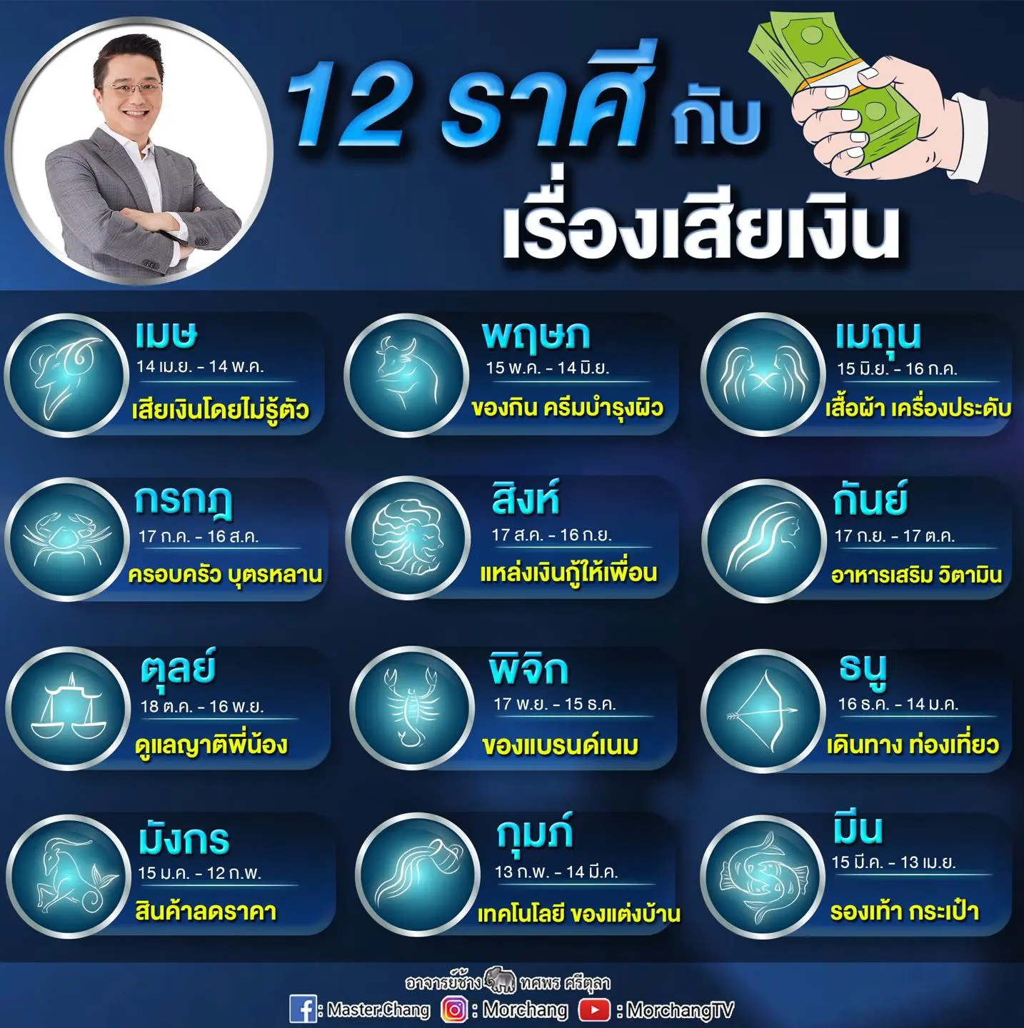 หมอช้าง หรือ นาย ทศพร ศรีตุลา หมอดูนักพยากรณ์ชื่อดังของไทย ได้โพสต์ภาพพร้อมข้อความผ่านทางเพจเฟสบุ้ค หมอช้าง ทศพร ศรีตุลา ว่า 12 ราศี กับเรื่องเสียเงิน