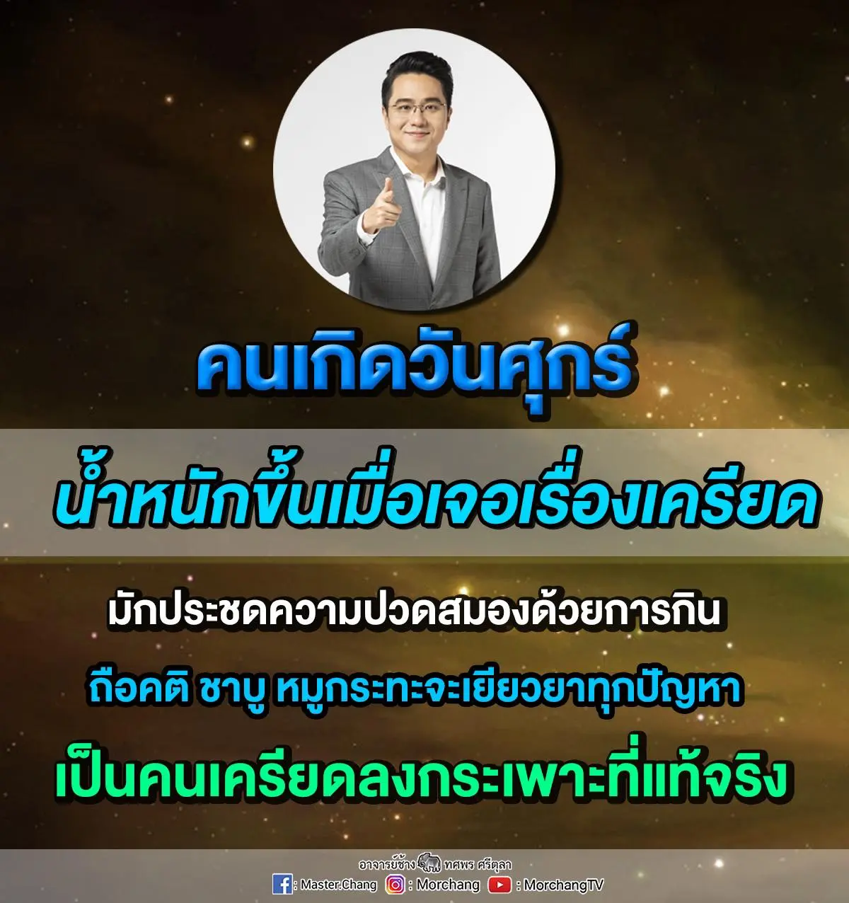 หมอช้าง หรือ นาย ทศพร ศรีตุลา หมอดูนักพยากรณ์ชื่อดังของประเทศไทย ได้โพสต์ภาพพร้อมข้อความผ่านทางเพจเฟซบุ๊ก หมอช้าง ทศพร ศรีตุลา ว่า คนเกิดวันศุกร์ เครียดลงกระเพาะ