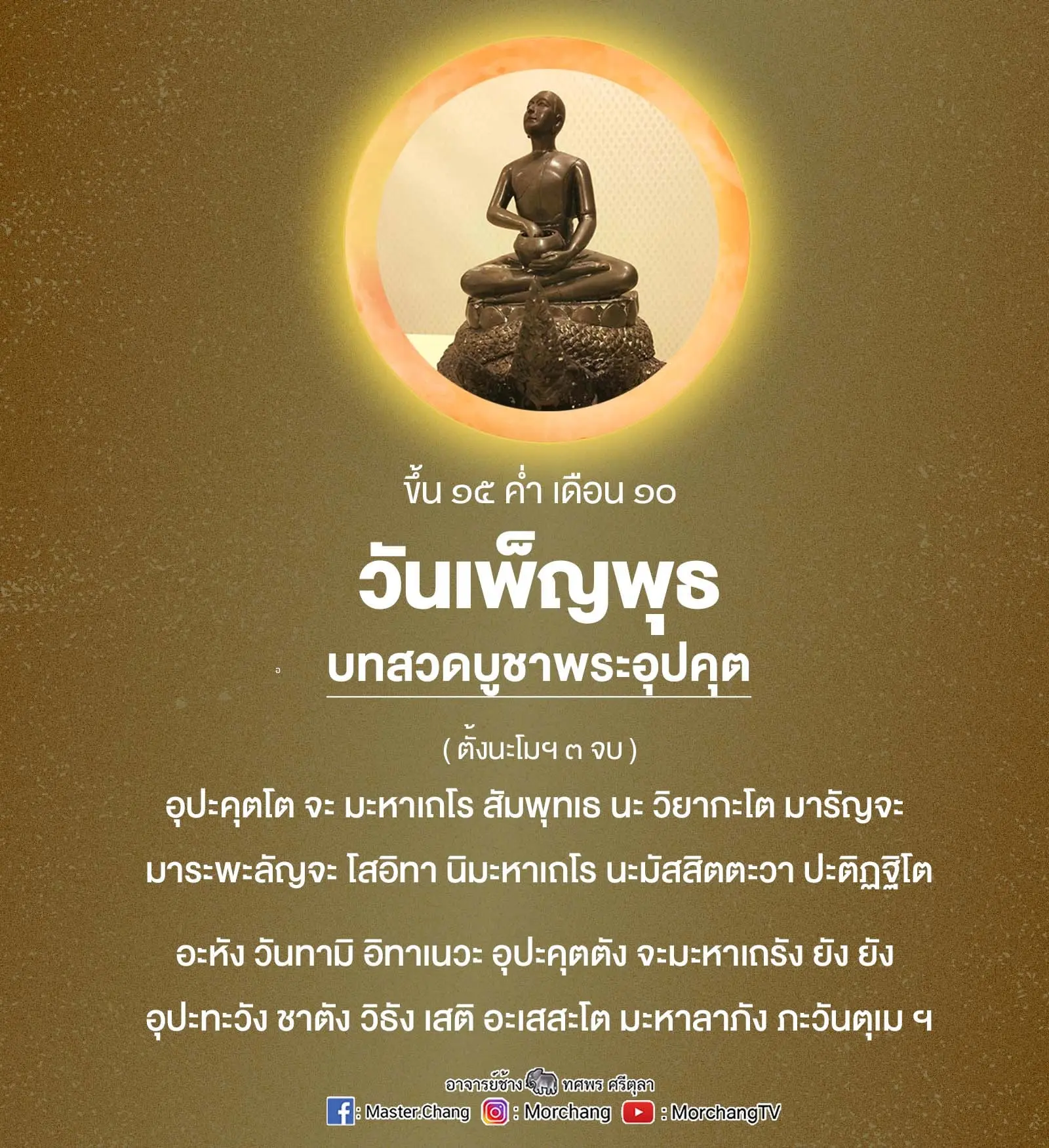 อุปะคุตโต จะ มะหาเถโร สัมพุทเธ นะ วิยากะโต มารัญจะ มาระพะลัญจะ โสอิทา นิมะหาเถโร นะมัสสิตะตะสา ปะติฏฐิโต อะหัง วันทามิ อิทาเนวะ อุปะคุตตัง จะมะหาเถรัง ยัง ยัง อุปะทะวัง ซาตัง วิธัง เสติ อะเสสะโต มะหาลาภัง ภะวันตุเมฯ