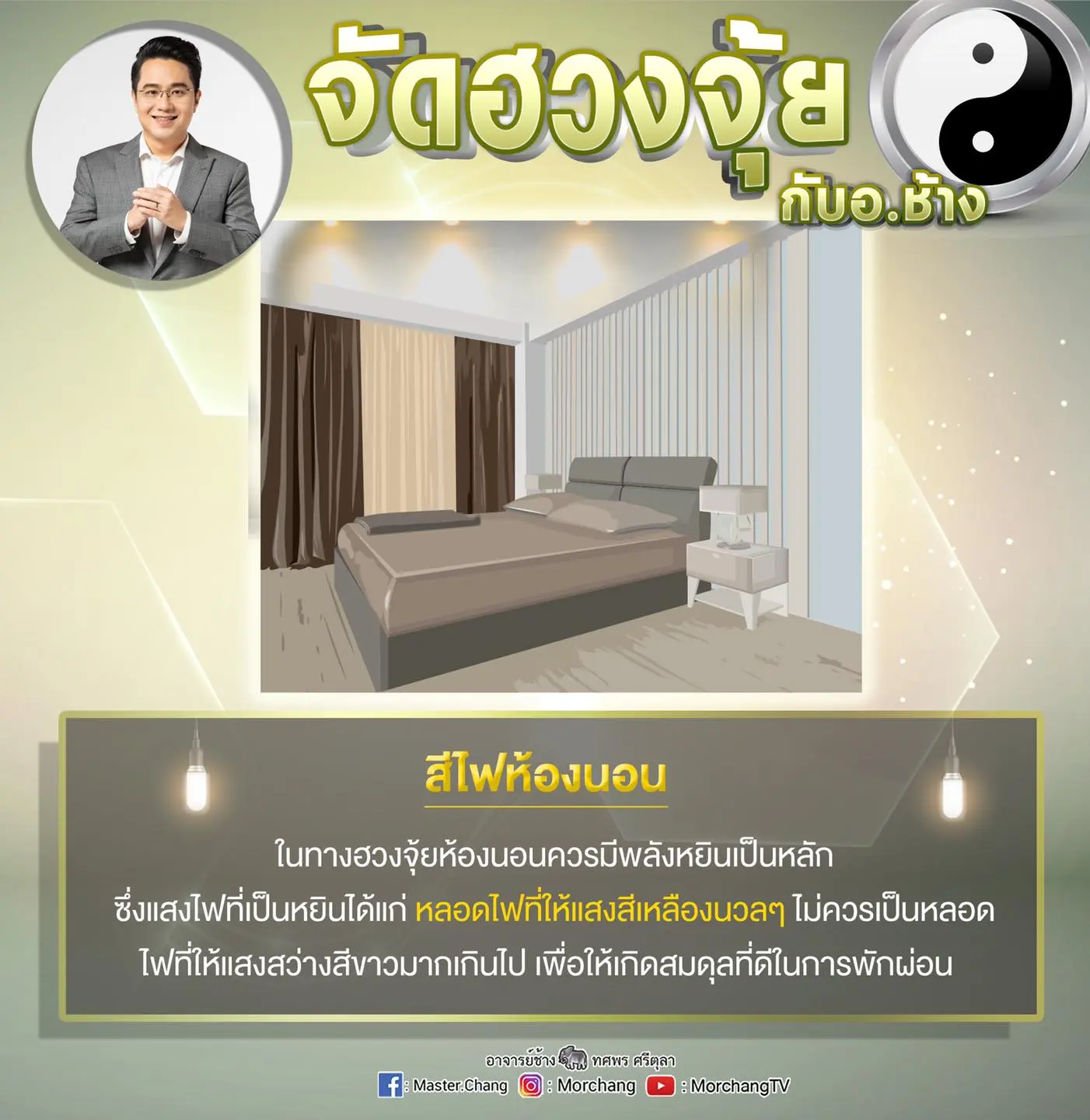 สีไฟห้องนอน ในทางฮวงจุ้ยห้องนอนควรมีพลังหยินเป็นหลัก ซึ่งแสงไฟที่เป็นหยินได้แก่ หลอดไฟที่ให้แสงสีเหลืองนวลๆ ไม่ควรเป็นหลอดไฟที่ให้แสงสว่างสีขาวมากเกินไป เพื่อให้เกิดสมดุลที่ดีในการพักผ่อน