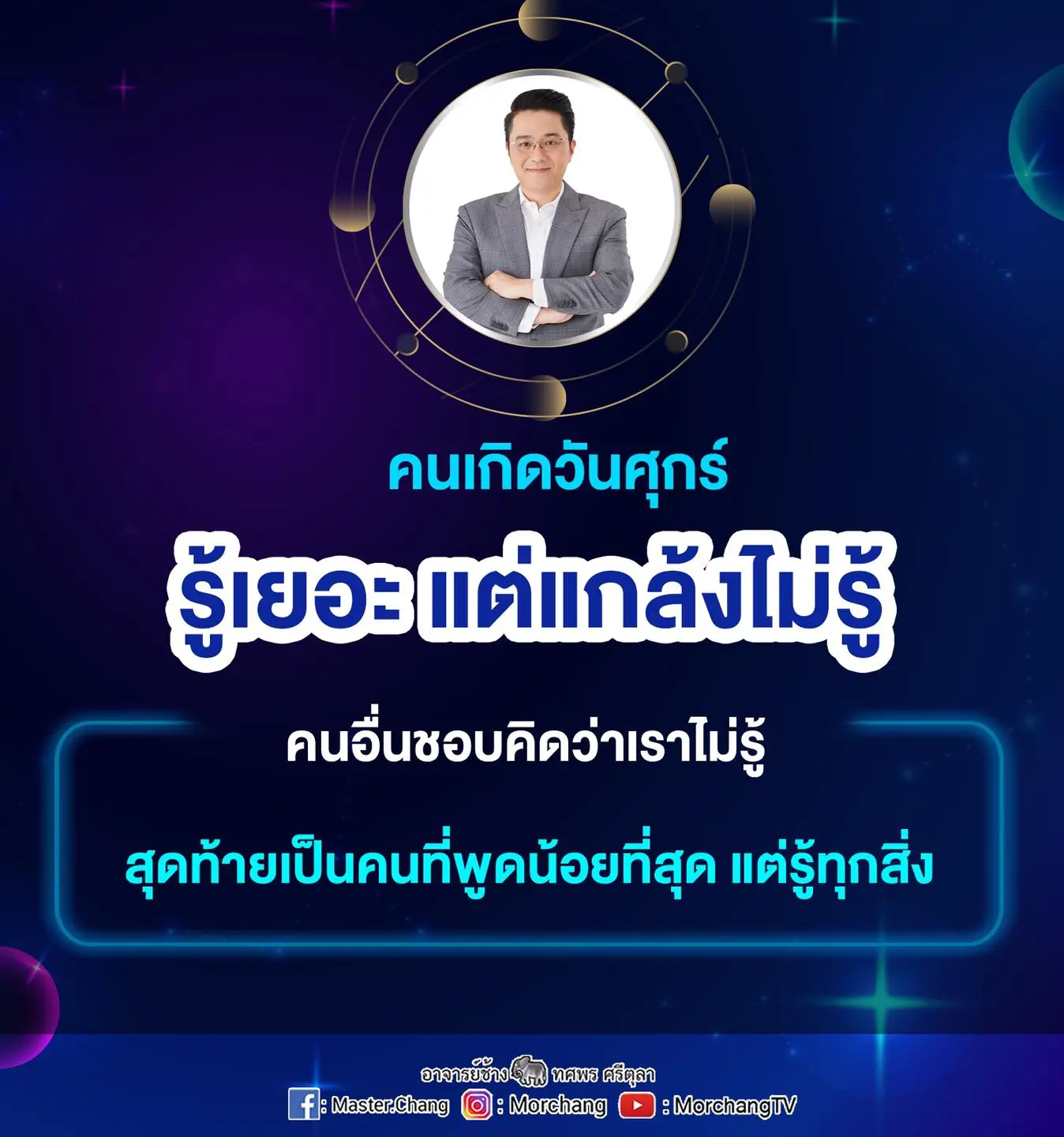 หมอช้าง หรือ นาย ทศพร ศรีตุลา หมอดูนักพยากรณ์ชื่อดังของประเทศไทย ได้โพสต์ภาพพร้อมข้อความผ่านทางเพจเฟซบุ๊ก หมอช้าง ทศพร ศรีตุลา ว่า คนเกิดวันศุกร์