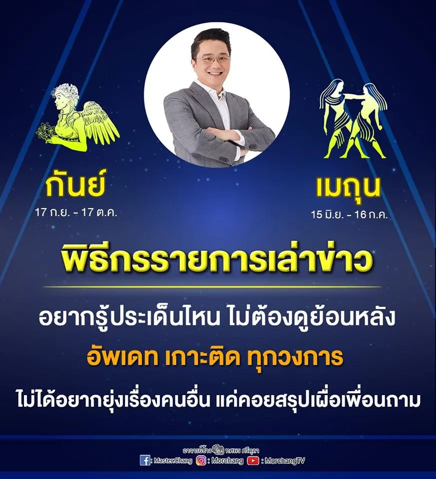 หมอช้าง หรือ นาย ทศพร ศรีตุลา หมอดูนักพยากรณ์ชื่อดังของประเทศไทย ได้โพสต์ภาพพร้อมข้อความผ่านทางเพจเฟสบุ้ค หมอช้าง ทศพร ศรีตุลา ถึงกลุ่มคน ราศีกันย์ และ ราศีเมถุน ว่า ราศีผู้ประกาศข่าว
