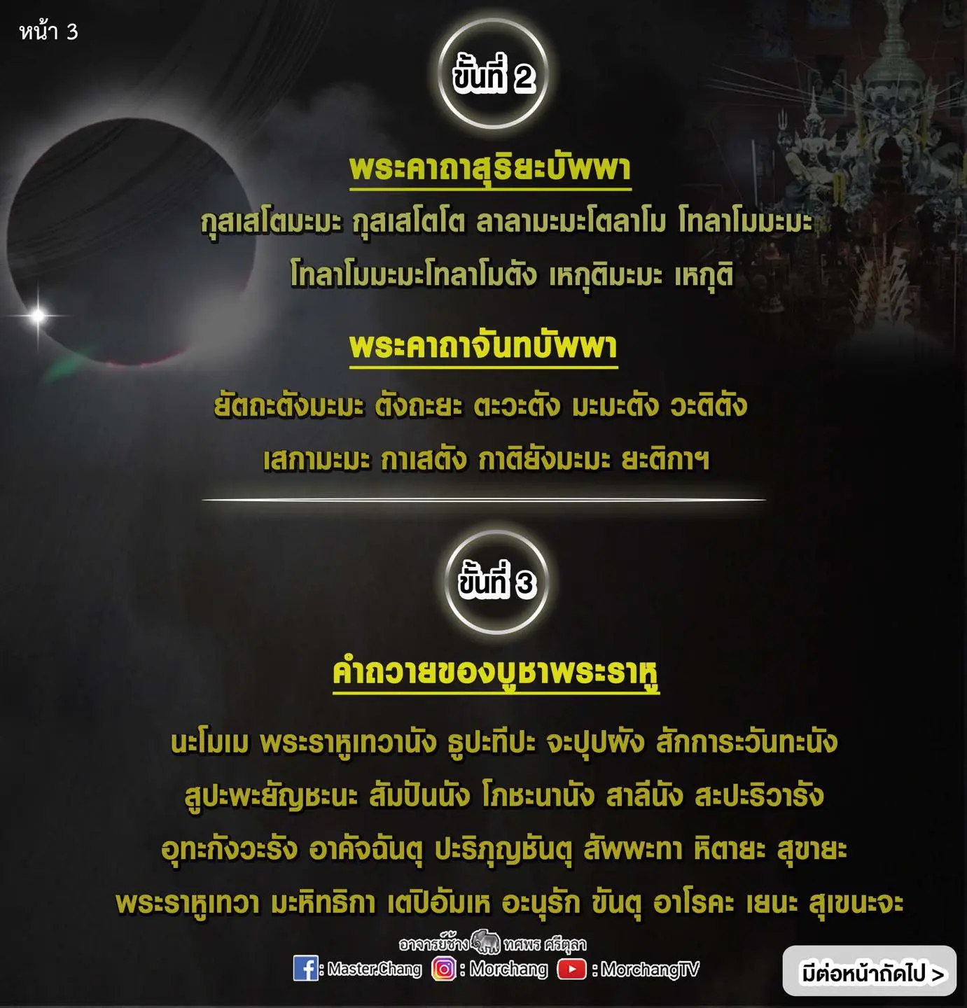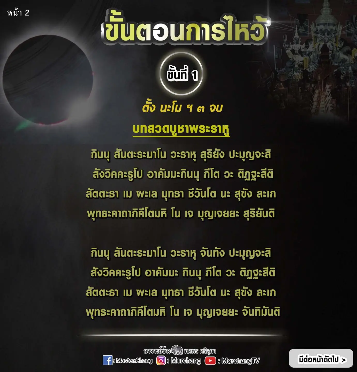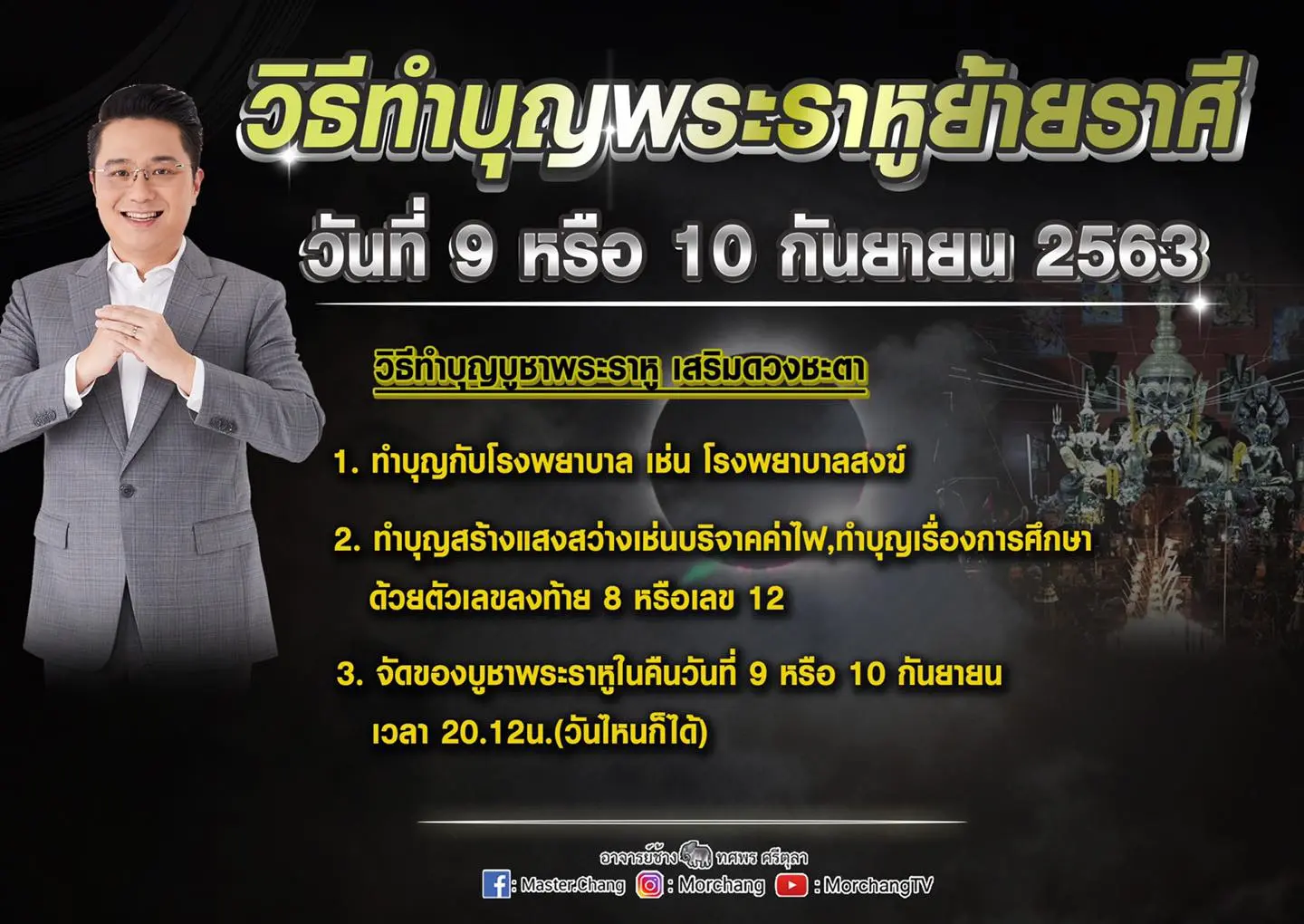 หมอช้าง หรือ นาย ทศพร ศรีตุลา หมอดูนักพยากรณ์ชื่อดังของประเทศไทย ได้โพสต์ภาพพร้อมข้อความผ่านทางเพจเฟซบุ๊ก หมอช้าง ทศพร ศรีตุลา ว่า นำวิธีการทำบุญและบทสวดช่วงพระราหูย้ายราศีมาฝากนะครับ สามารถสวดได้ทั้ง2วันคือวันที่9หรือ10กันยายนเวลา20.12น.(วันไหนก็ได้) หรือติดตามได้ที่MorchangTv Ep20ที่linkนี้ครับ https://www.facebook.com/151349859708/posts/10158547956079709/