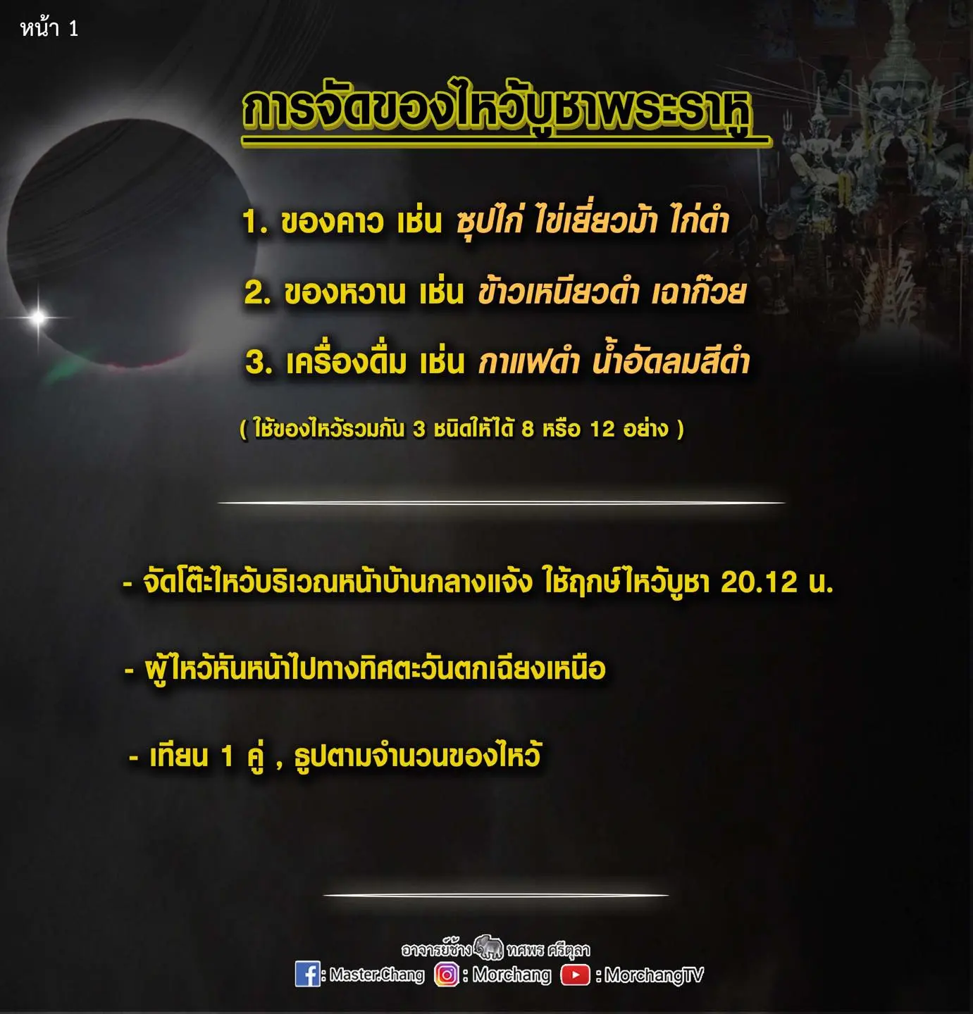 - จัดของบูชาพระราหูในคืนวันที่ 9 หรือ 10 กันยายน เวลา 20.12 น. (วันไหนก็ได้)