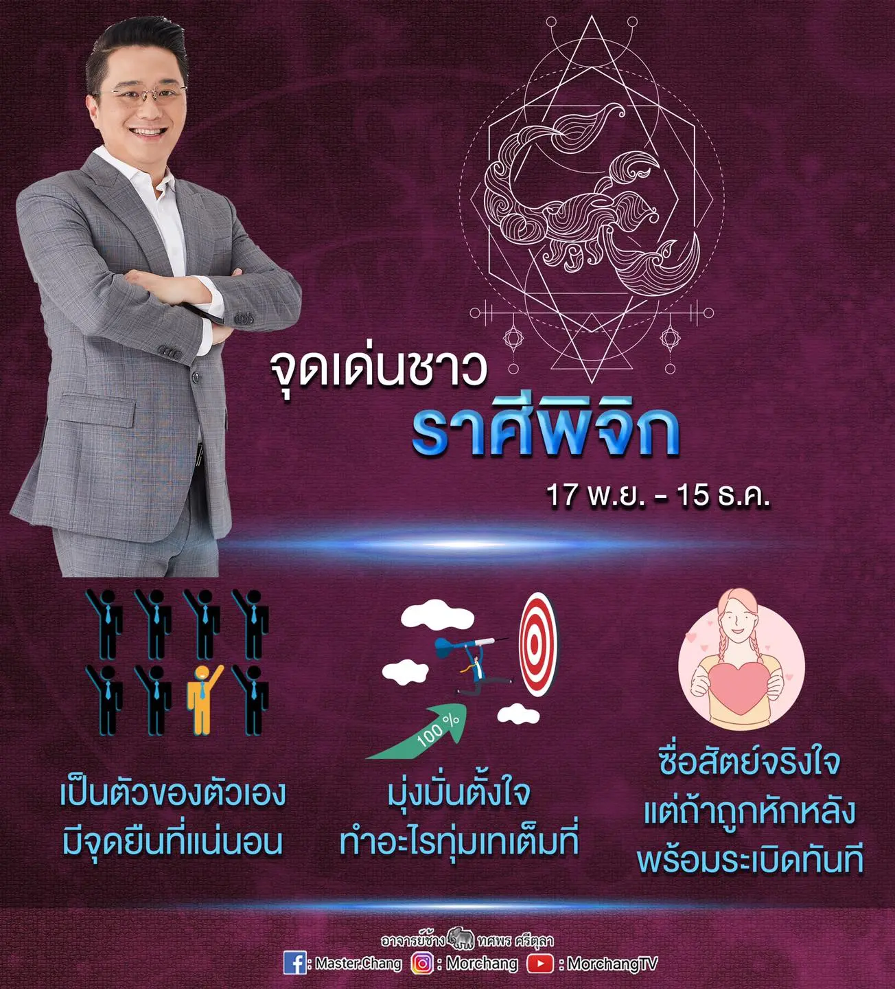 หมอช้าง หรือ นาย ทศพร ศรีตุลา หมอดูนักพยากรณ์ชื่อดังของประเทศไทย ได้โพสต์ภาพพร้อมข้อความผ่านทางเพจเฟซบุ๊ก หมอช้าง ทศพร ศรีตุลา ว่า ราศีพิจิก