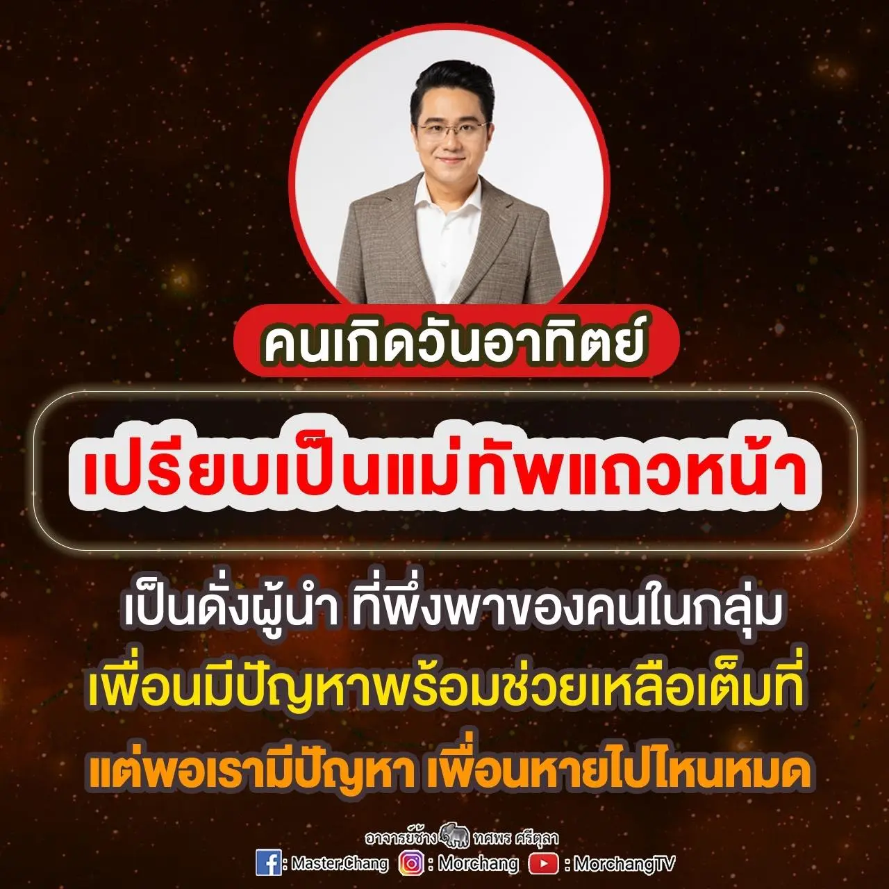 หมอช้าง หรือ นาย ทศพร ศรีตุลา หมอดูนักพยากรณ์ชื่อดังของประเทศไทย ได้โพสต์ภาพพร้อมข้อความผ่านทางเพจเฟซบุ๊ก หมอช้าง ทศพร ศรีตุลา ว่า คนเกิดวันอาทิตย์