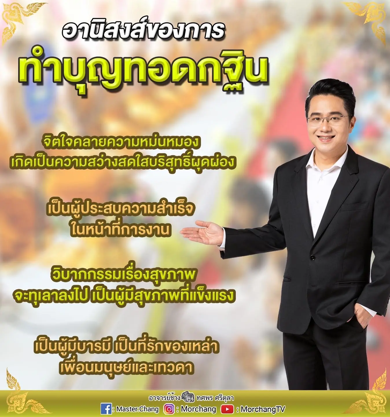 หมอช้าง หรือ นาย ทศพร ศรีตุลา หมอดูนักพยากรณ์ชื่อดังของประเทศไทย ได้โพสต์ภาพพร้อมข้อความผ่านทางเพจเฟซบุ๊ก หมอช้าง ทศพร ศรีตุลา ว่า ขออนุโมทนาบุญกับทุกท่านที่ได้ทอดกฐินในปีนี้กันนะครับ