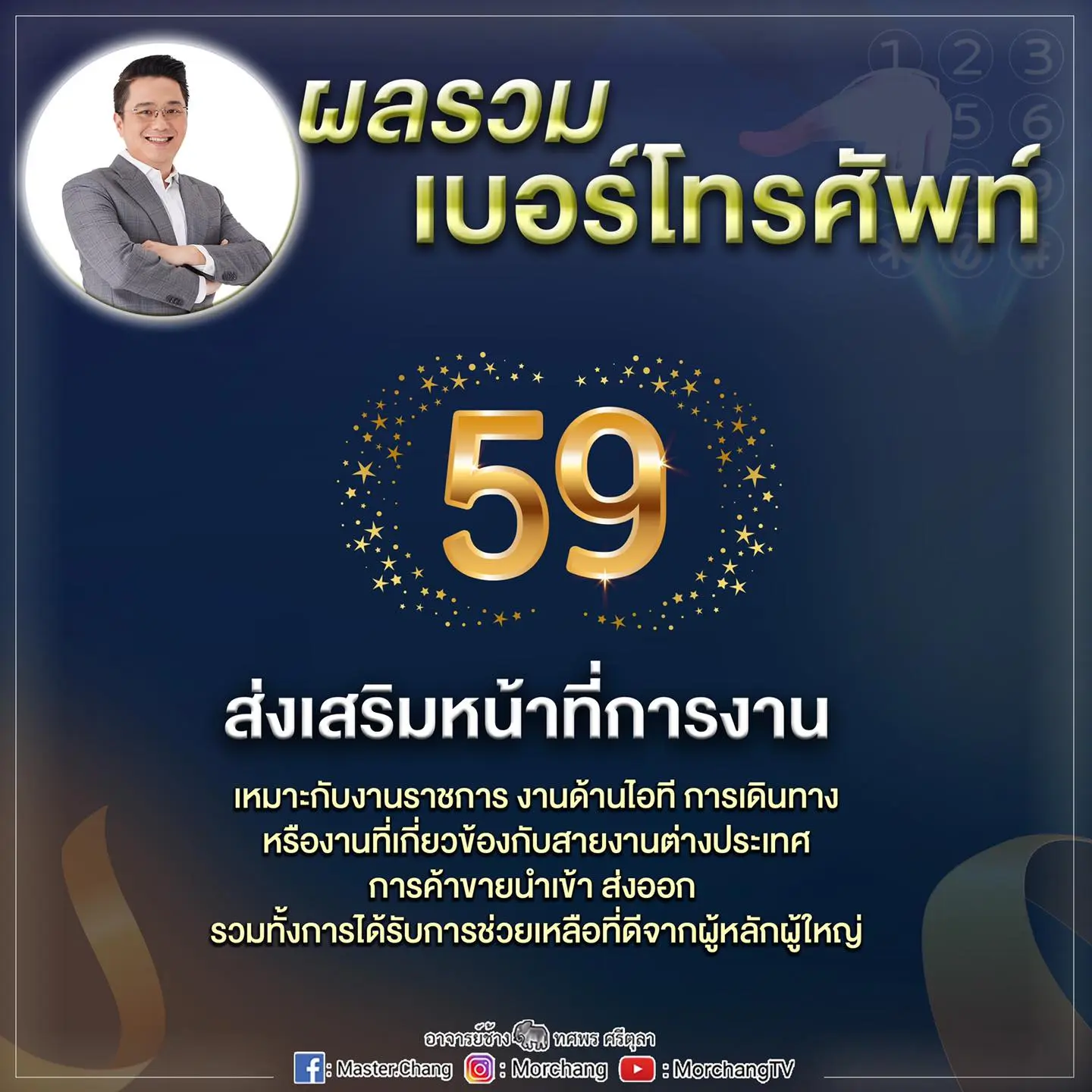 ผลรวมเบอร์โทรศัพท์ 59 ส่งเสริมหน้าที่การงาน เหมาะกับงานราชการ งานด้านไอที การเดินทาง หรืองานที่เกี่ยวข้องกับสายงานต่างประเทศ การค้าขายนำเข้า ส่งออก รวมทั้งการได้รับการช่วยเหลือที่ดีจากผู้หลักผู้ใหญ่