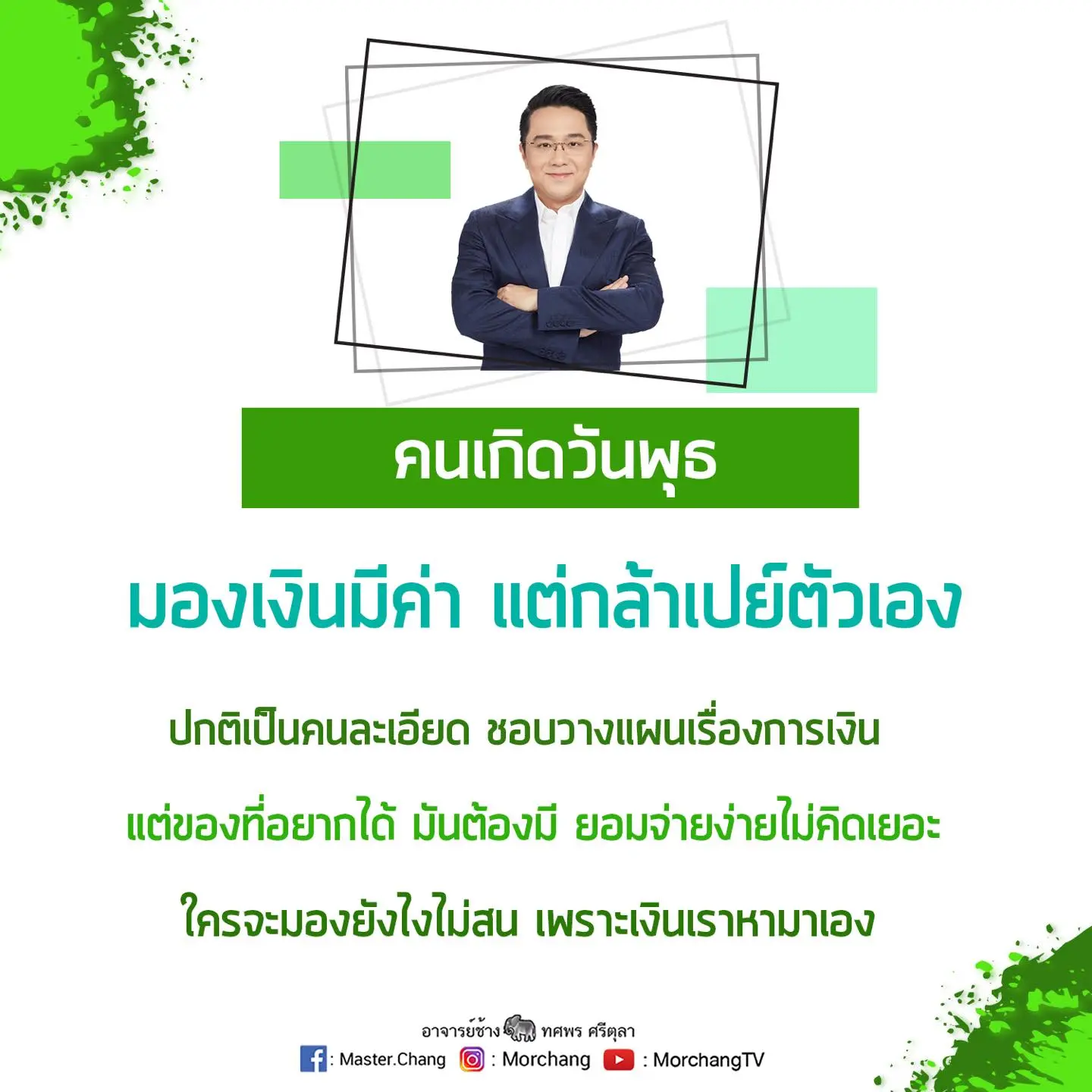 หมอช้าง ทศพร ศรีตุลา เผย ดวงวันเกิด ที่รู้จักคุณค่าของเงินที่สุด แต่ยิ่งรู้จักกลับยิ่งใช้เงิน โดยได้เผยผ่านทางแฟนเพจ หมอช้าง ทศพร ศรีตุลา