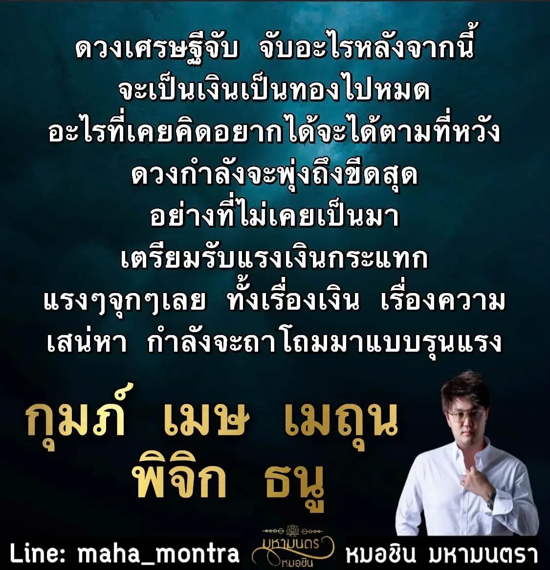 หมอชิน มหามนตรา เผย ดวง 5 ราศี เศรษฐีจับ เตรียมรับเงิน รับทรัพย์ และรับรัก รับแรงกระแทกแบบจุกๆ โดยได้โพสต์ผ่านแฟนเพจ หมอชิน มหามนตรา