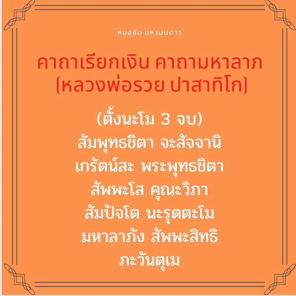 หมอชิน มหามนตรา เผย คาถาเรียกเงิน คาถามหาลาภ หลวงพ่อรวย ปาสาทิโก ให้โชค ให้ลาภ ให้เงิน ให้ทอง โดยได้โพสต์ผ่านแฟนเพจ หมอชิน มหามนตรา