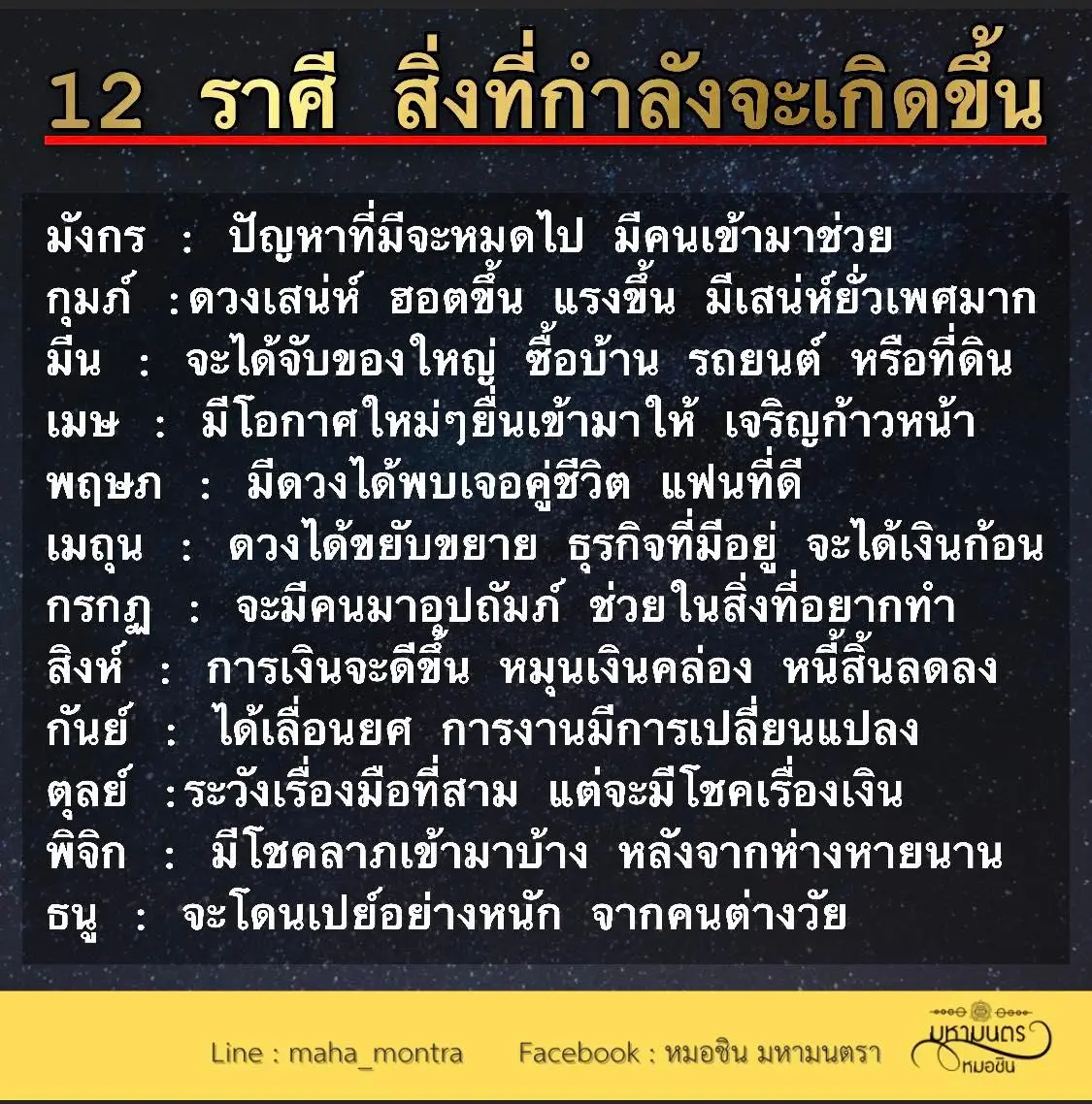 หมอชิน มหามนตรา เผย ดวง 12 ราศี สิ่งที่จะเกิดขึ้น ภาพรวมดวงชะตาของแต่ละราศีที่จะเกิดขึ้นในช่วงนี้ โดยได้โพสต์ผ่านแฟนเพจ หมอชิน มหามนตรา