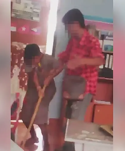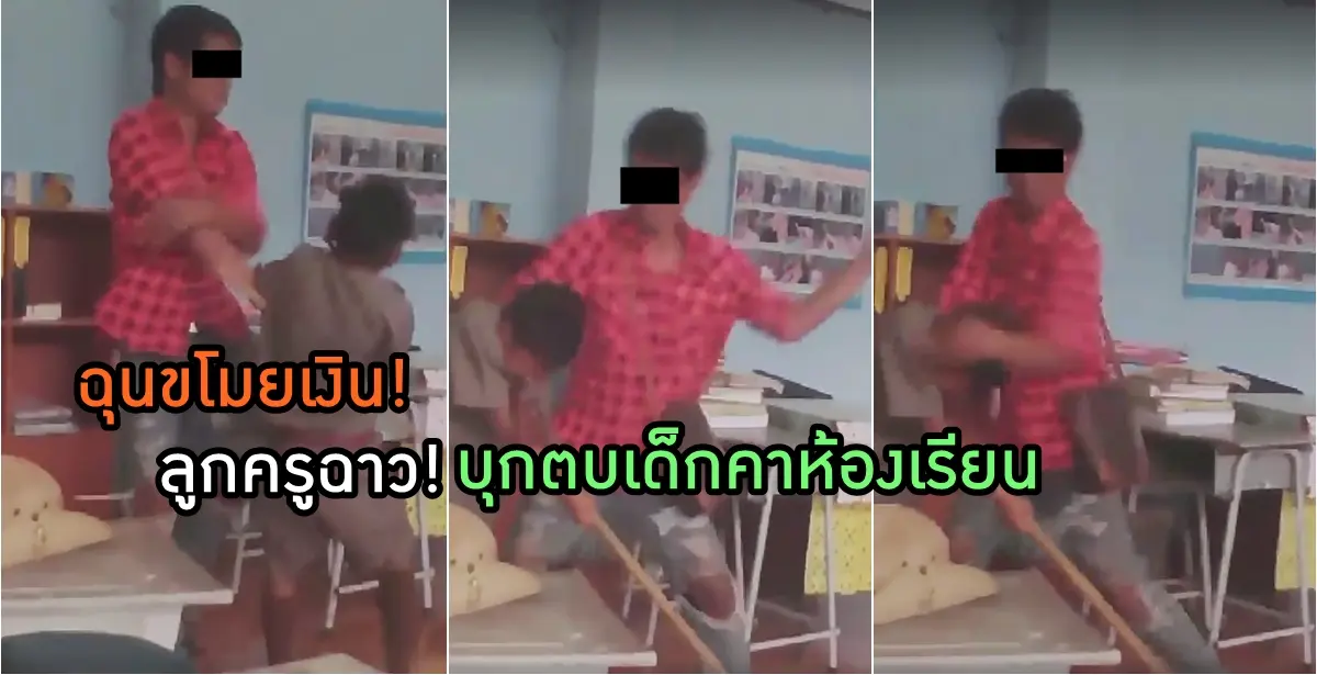โผล่หราโซเชี่ยล! คลิปชายเสื้อสีแดงที่ระบุว่าเป็นลูกของครูในโรงเรียนบุกตบหน้าเด็กชายวัย 11 ขวบคาห้องเรียน โซเชี่ยลชี้ลูกครูฉุนเด็กขโมยเงินแม่ของตน โซเชี่ยลจวกโรงเรียนปล่อยคนนอกเข้ามาทำร้ายเด็กแบบนี้ได้อย่างไร