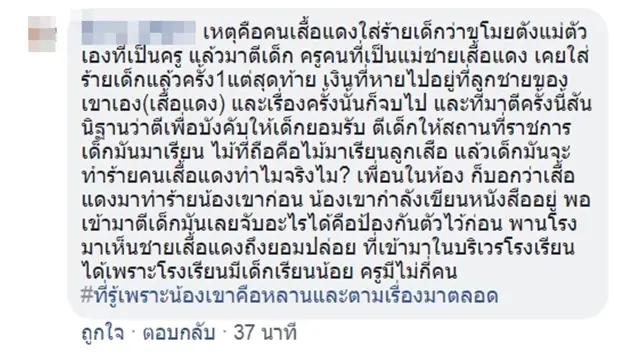 ทั้งนี้มีการเปิดเผยมูลเหตุความขัดแย้งชี้ว่าชายเสื้อแดงไม่พอใจที่เด็กขโมยเงินแม่ที่เป็นครูสอนอยู่ที่ดรงเรียนดังกล่าว อีกทั้งเด็กยังไม่ยอมรับจึงบุกมาเค้นความจริงถึงห้องเรียนก่อนจะปรากฏเหตุการณ์ตามคลิปที่กำลังเป็นที่วิพากษ์วิจารณ์อย่างหนักขณะนี้