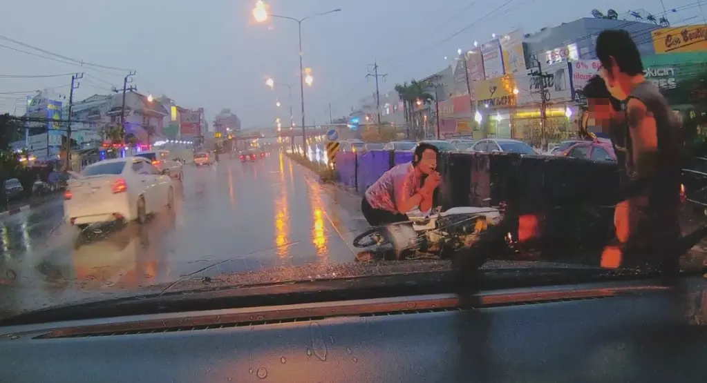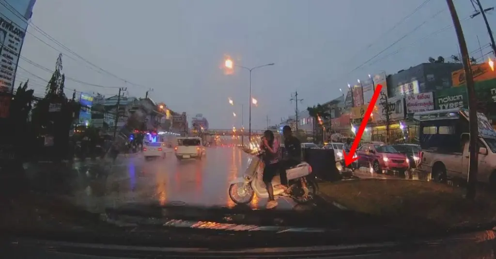 ดูไว้เป็นอุทาหรณ์เลยกับการใช้รถใช้ถนนในวันที่สภาพอากาศเลวร้าย กล้องหน้ารถยนต์เผยให้เห็นมอเตอร์ไซค์ใช้ช่องทางลัดกลับรถทำรถเก๋งที่ขับมาต้องเบรคในระยะประชิดก่อนจะถูกรถที่ตามมาด้านหลังชนท้ายจนพุ่งไปชนมอเตอร์ไซค์ล้มคว่ำ
