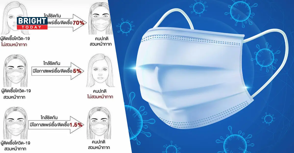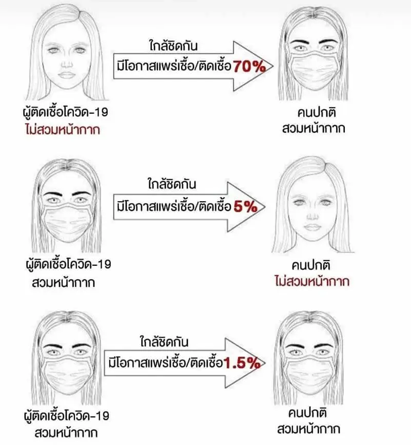 ถ้าคนติดเชื้อไม่ใส่หน้ากากอนามัย คนปกติใส่หน้ากาก จะลดการรับเชื้อได้ร้อยละ 30ถ้าคนติดเชื้อใส่หน้ากากอนามัย คนปกติไม่ได้ใส่หน้ากาก จะลดการรับเชื้อได้ร้อยละ 95ถ้าทั้งคนติดเชื้อ และคนปกติ ต่างใส่หน้ากากอนามัย จะลดการรับเชื้อได้ร้อยละ 98.5 (ดูรูป)ขณะนี้เป็นเรื่องจำเป็นที่ทุกคนควรใส่หน้ากากอนามัยเวลาอยู่ในที่สาธารณะผู้คนแออัด อากาศปิด ถ่ายเทไม่ดี ติดตั้งเครื่องปรับอากาศ