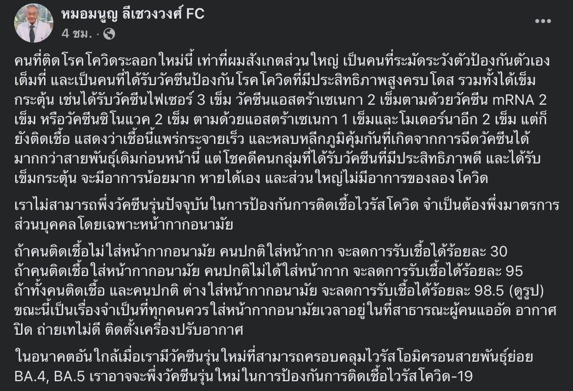 ล่าสุด 04 ก.ค. 65 เฟสบุ๊ก หมอมนูญ ลีเชวงวงศ์ FC นพ.มนูญ ลีเชวงวงศ์ ผู้เชี่ยวชาญด้านระบบทางเดินหายใจ รพ.วิชัยยุทธ ได้ออกมาโพสต์เกี่ยวกับ เชื้อ โควิด 19 สายพันธุ์ใหม่นี้ว่ามีความสามารถในการแพร่เชื้อได้ดีขึ้น
