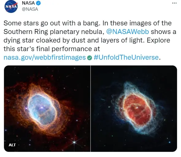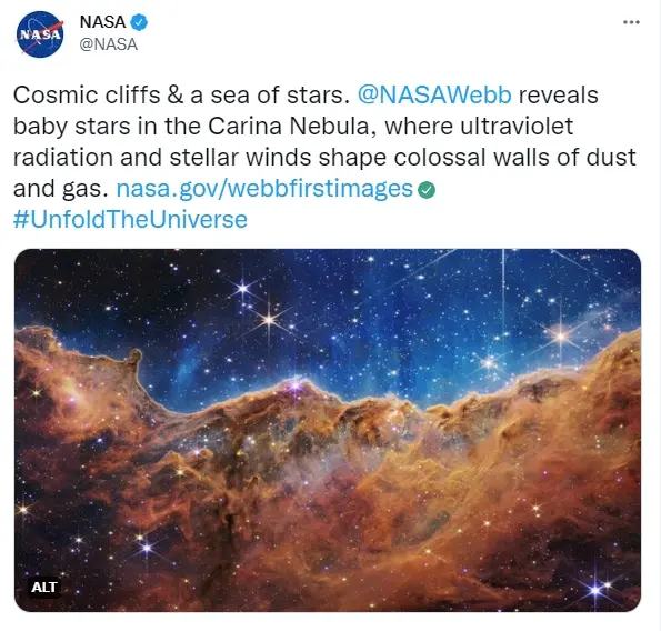 ซึ่งผลงาน กล้องโทรทรรศน์อวกาศ เจมส์ เวบบ์ ประกอบด้วยภาพ เนบิวลากระดูกงูเรือ หรือ Carina Nebula ซึ่งอยู่ห่างจากโลกประมาณ 7,600 ปีแสง และใหญ่กว่าดวงอาทิตย์มากมาย หลายเท่า